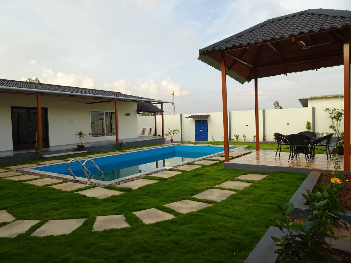 Farm spread across 4 acres which is on Bangalore-Mysore express way about 8kms after Channapatna. This 3 BHK pool villa with modern amenities and high speed WiFi provides green retreat for urban dwellers. Wake up in a place surrounded by fruit and vegetable gardens, calls of peacocks and chirps of birds. For movie lovers, enjoy the projector movie night in an open space. Complete your stay enjoying the outdoor fireplace. Come and stay with us to rejuvenate, refresh and relax!