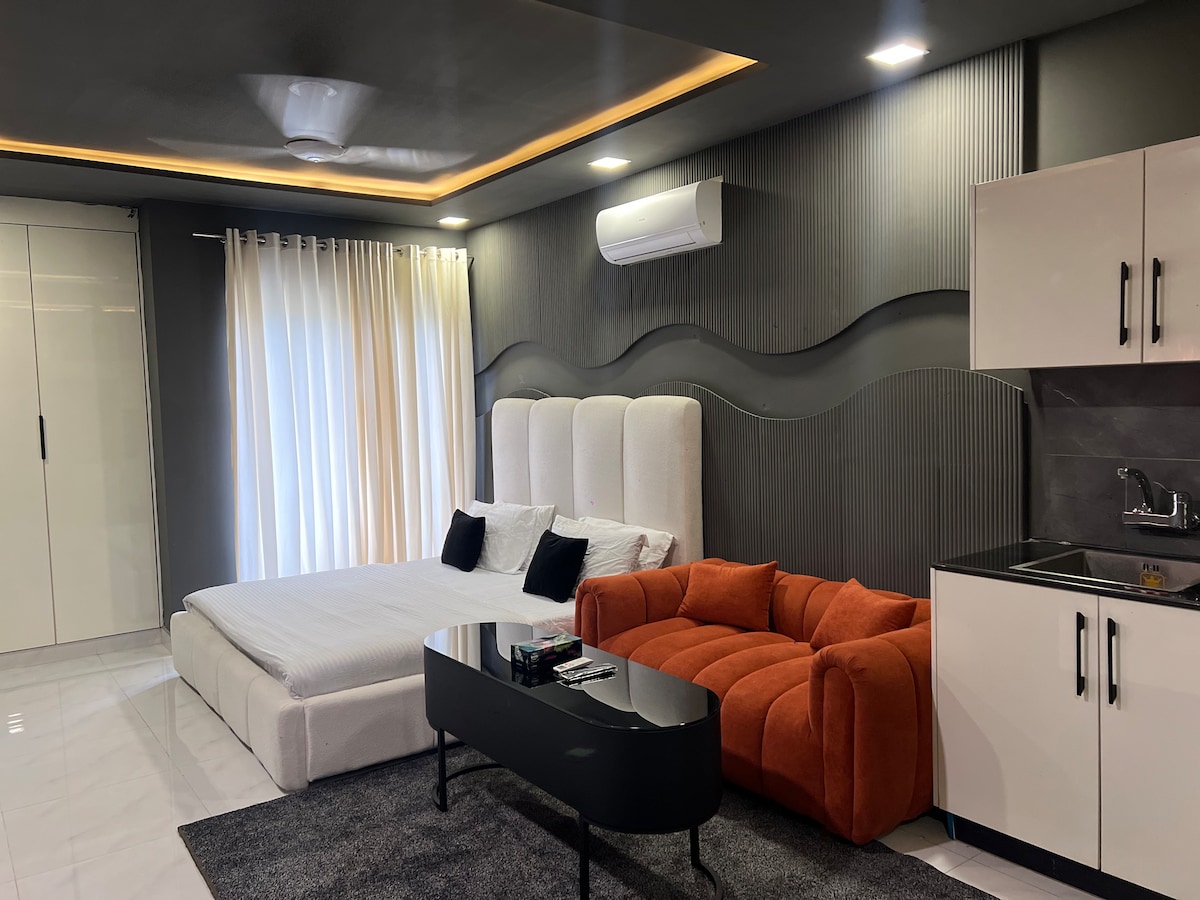 Bienvenue à The Aura Stays — comme à la maison, mais en mieux. Studio moderne et confortable avec un lit King Size, un canapé en cuir, une télévision connectée avec Netflix et une connexion Wi-Fi rapide. Profitez d'une vue imprenable, d'un éclairage doux et d'un décor élégant. Comprend une kitchenette compacte avec bouilloire et une salle de bain propre et moderne. Situé dans un immeuble sécurisé au cœur de Bahria Town, à proximité des cafés, des parcs et des sites emblématiques. Parfait pour les voyageurs en solo, les couples ou les séjours d'affaires. Réservez maintenant pour profiter de confort, d'élégance et de tranquillité.