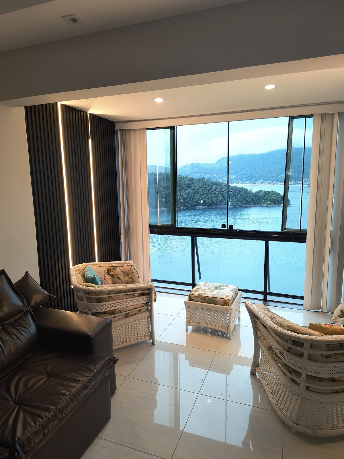 Située dans l'appartement en résidence de Portogalo à côté de la plage calme de Cazuza,la Casa offre une vue imprenable sur la mer bleue et la grande île,parfaite pour ceux qui recherchent la détente et le contact avec la nature. En entrant dans la maison, vous êtes accueillis par un environnement moderne et aéré. Le salon, avec de grandes fenêtres en verre, offre une vue panoramique sur l'océan. Des canapés confortables et une table basse accueillent des moments de détente.