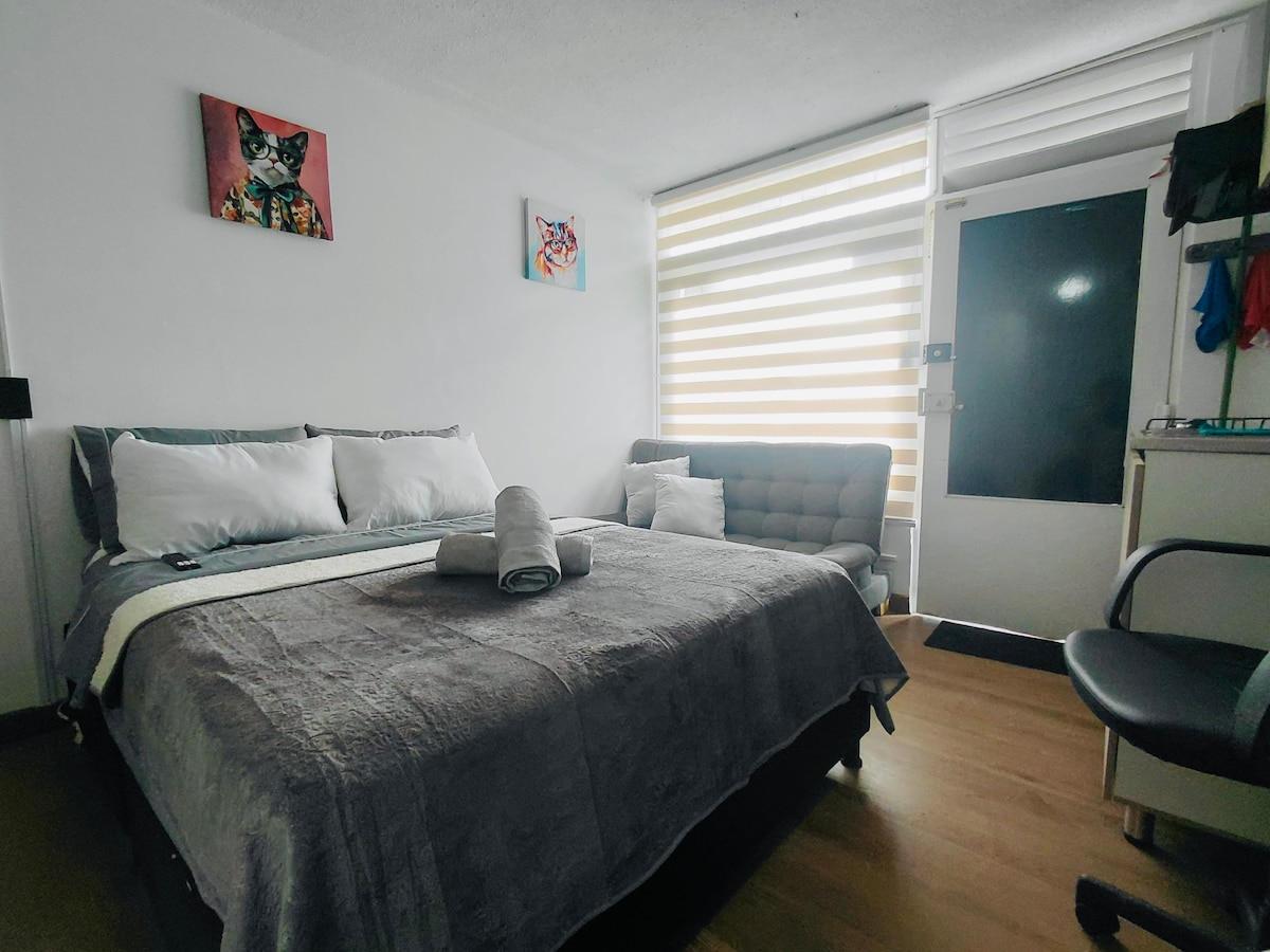 Profitez du confort et du charme de cet appartement confortable, parfait pour des séjours courts ou longs dans la ville aux portes ouvertes : Manizales. Avec une chambre avec lit double, 2 placards, TV, balcon avec vue panoramique, cuisine équipée, bar américain et salle de bain moderne, cet espace fonctionnel est idéal pour se reposer. Proche des universités et des restaurants. Important : nous n'avons pas de parking privé.
