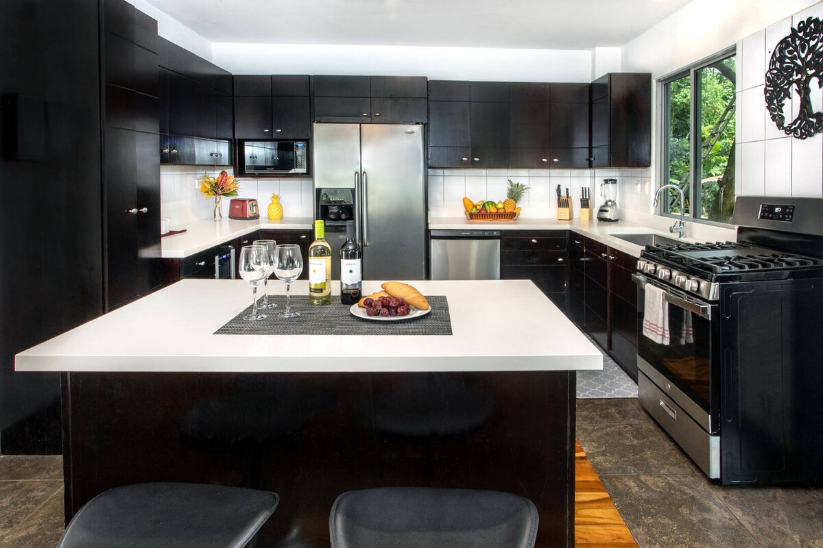 Cette maison contemporaine de 4 chambres avec lit King Size et salle de jeux, entièrement climatisée, est située au centre de Manuel Antonio et est parfaite pour les familles et les amis. La maison se trouve au-dessus de la canopée de la forêt tropicale de Manuel Antonio et donne directement sur le littoral du Pacifique. Avec une piscine privée, un barbecue extérieur et un grand patio, vous pourrez vous détendre et profiter pleinement de votre temps avec vos proches. Les vues sur l'océan de tous les niveaux sont spectaculaires alors que vous regardez par-dessus la cime des arbres de la forêt tropicale en contrebas.