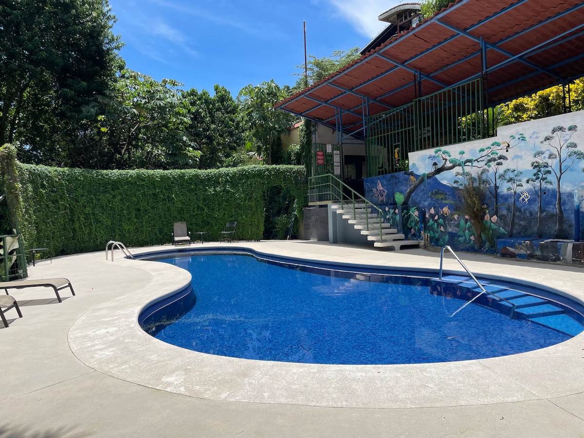 Situé au cœur de Manuel Antonio, confortable, sûr et entièrement équipé avec cuisine, une chambre, une salle de bains et un salon spacieux, supermarché à 50 m. Services supplémentaires : blanchisserie, cours de yoga sur la plage, visites d'une cascade incroyable et navette pour l'aéroport.