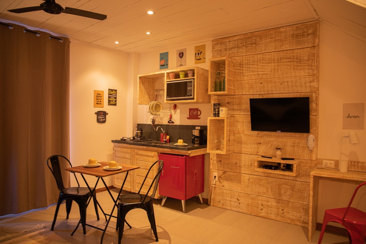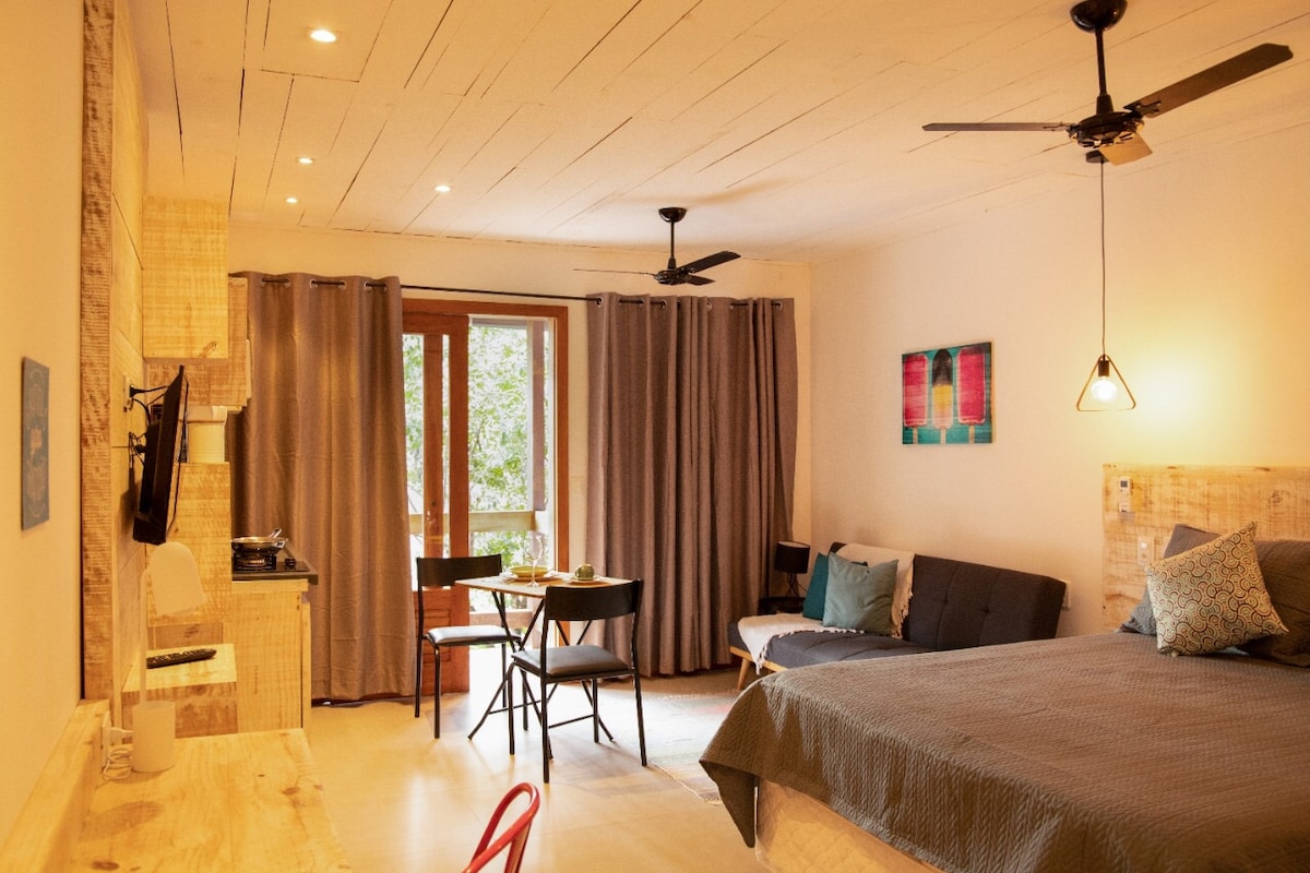 Avec un excellent emplacement, cet espace peut être décrit comme une escapade au coeur d'Itacaré. Le studio dispose d'un jardin privé, d'une cuisine de soutien, d'un lit queen size, dans un environnement aéré - le tout conçu pour la commodité et le confort des invités. Bien que centrale, la région est très calme. Le silence, la sécurité et le bon quartier sont présents.