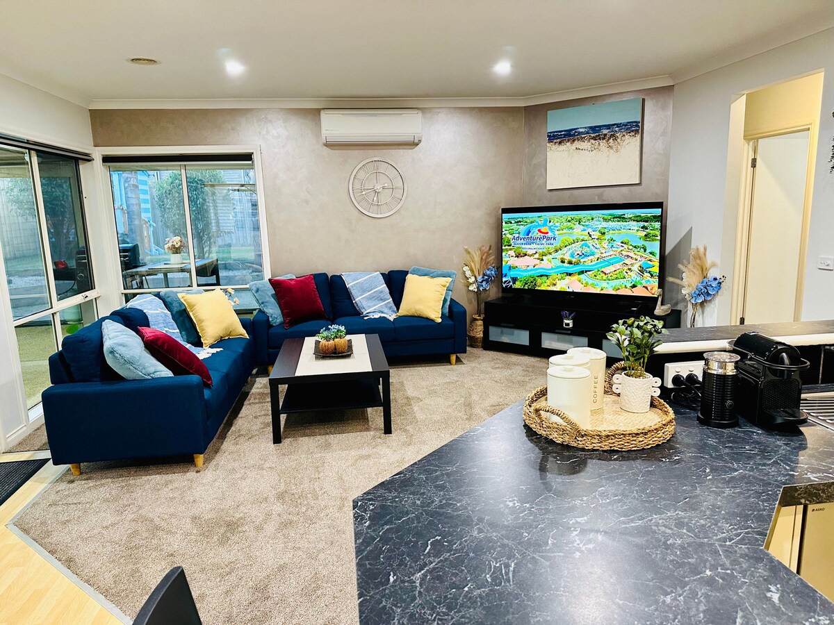 La maison est là où se trouve le cœur. Éloignez-vous de l'agitation de la vie urbaine et détendez-vous dans ma maison gracieusement aménagée offrant un nouveau sauna infrarouge extérieur. La Casa Serenitá est idéale pour les couples ou les petites familles à la recherche d'une retraite de week-end reposante ou pour les voyageurs d'affaires à la recherche d'un refuge paisible en semaine. La maison est idéalement située dans un quartier calme près du quartier d'affaires de Geelong, du front de mer, du stade GMHBA ainsi que de toute ville ou attractions touristiques de la péninsule de Bellarine.