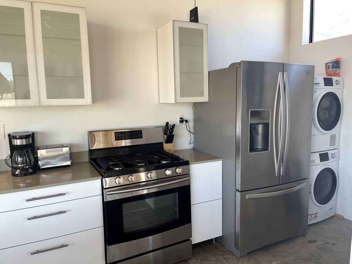 À un pâté de maisons du palais de justice, cette élégante casita 1/1 nouvellement construite est un espace ouvert et accueillant pour les couples, les amis ou une famille de 4 personnes. Une maison de style studio avec une grande chambre avec lit Queen Size, cuisine et salle de bain, lave-linge/sèche-linge et un spacieux salon/salle à manger avec plafonds voûtés de 13 pieds. À seulement 2 minutes à pied du centre-ville de Marfa, de l'hôtel Paisano, de la Fondation Judd, des restaurants locaux, des galeries et des magasins. Coin salon extérieur privé. Parfait pour les week-ends ainsi que pour les séjours longue durée.