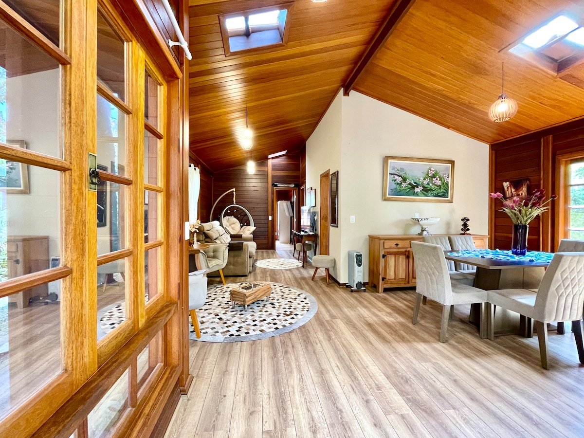 Le matin, nous écoutons les oiseaux, fuyant un peu le mouvement du centre, peu de maisons, beaucoup d'arbres et une ambiance familiale. La maison est faite en Maçaranduba, une masonry en bois qui apporte le rustique avec une décoration très clean, apportant légèreté et paix à l'environnement, avec 2 chambres dont une suite, 1 salle de bain sociale, cuisine, salle à manger et salle de télévision combinée. Sur place, beaucoup d'arbres, non loin du centre, à 3,5 km, accès goudronné, avec 100 mètres de rue de terre, il y a 4 chalets sur place.