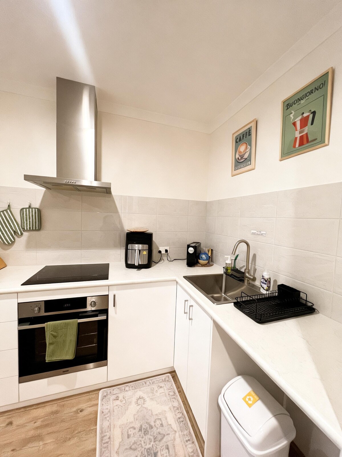 C'est un endroit génial. Parcourez tout Perth en train – à 6 minutes à pied de la gare. Si vous avez besoin de faire des courses, marchez 200 mètres en bas de la rue et vous trouverez un supermarché Coles. Une bouteille de vin, Liquor Land. Tous deux ouverts de 8 h à 21 h en semaine. Fern Coffee Lounge : pour un café, ou peut-être un petit déjeuner ou un déjeuner, ouvert de 6 h à 14 h. Plage à 5 minutes en voiture. La maison. Très originale. Grand espace salon ouvert avec de hauts plafonds et beaucoup de lumière, et une décoration moderne.