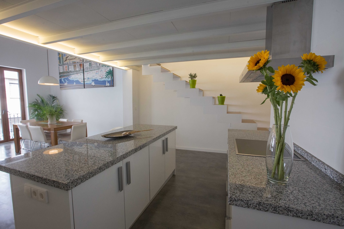 Magnifique loft-terrasse dans un immeuble du XIXe siècle entièrement rénové. Il dispose d'une grande terrasse sur le toit avec une vue imprenable sur la ville et la végétation, avec un accès direct depuis le séjour par un escalier japonais à marches alternées. Situé dans la vieille ville où vous trouverez la meilleure ambiance de restaurants et de bars branchés. La plage de Postiguet est à 500 m (7 minutes à pied). Idéal pour profiter de la ville à pied, de la plage ou des montagnes.