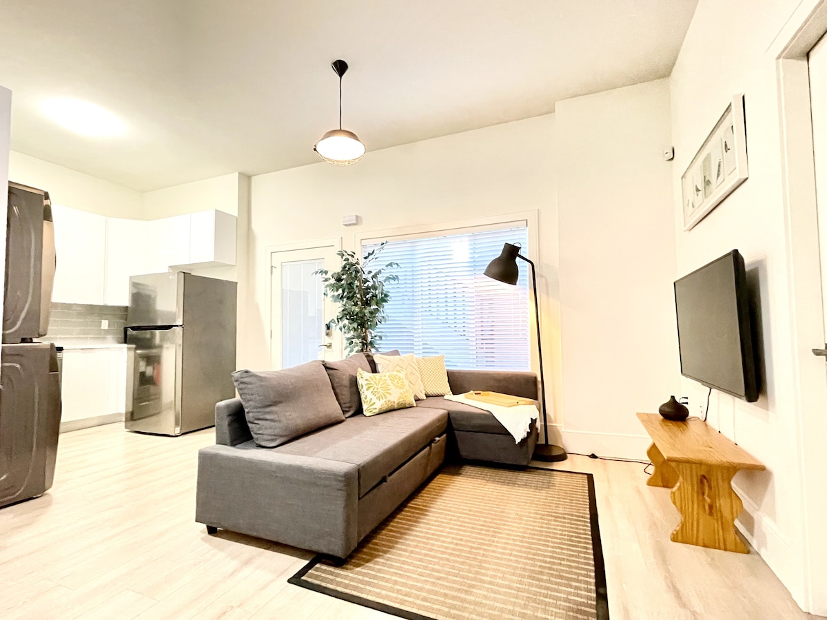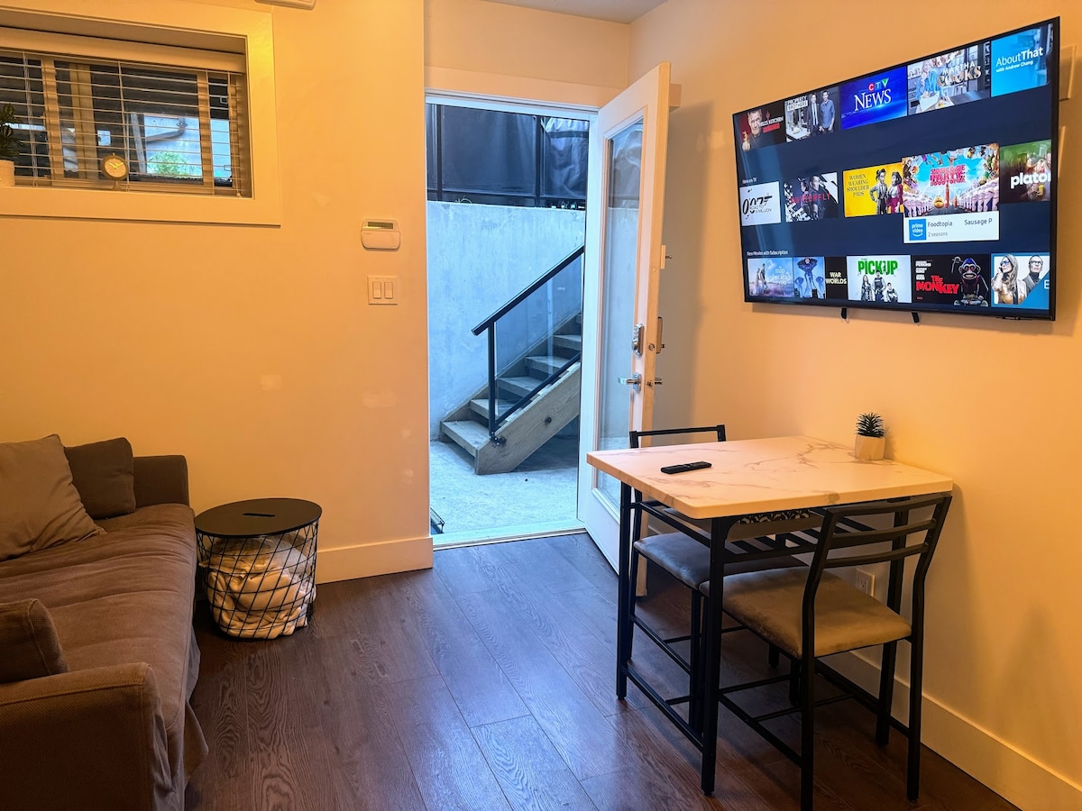Private entry & space : 500 square feet ( Nothing is shared with anyone ) with a quiet neighbourhood. Stay includes: ▩ Fun: LG 4K OLED TV + Apple TV + 4K Netflix + Marshall speaker + 1 Gbps WIFI ▩ Hot: Air Conditioner + Dyson fan ▩ Cold: Floor heat + Nest thermostat ▩ Bar: Microwave + Fridge + Nespresso + Starbucks capsules + Water Filter ▩ Clean: 2 in 1 LG Dryer/Washer + Toto washlet + Sanitizer ▩ Commute: 7min walk to restaurant/bike lane/walk to transit. 20min drive to YVR / Downtown