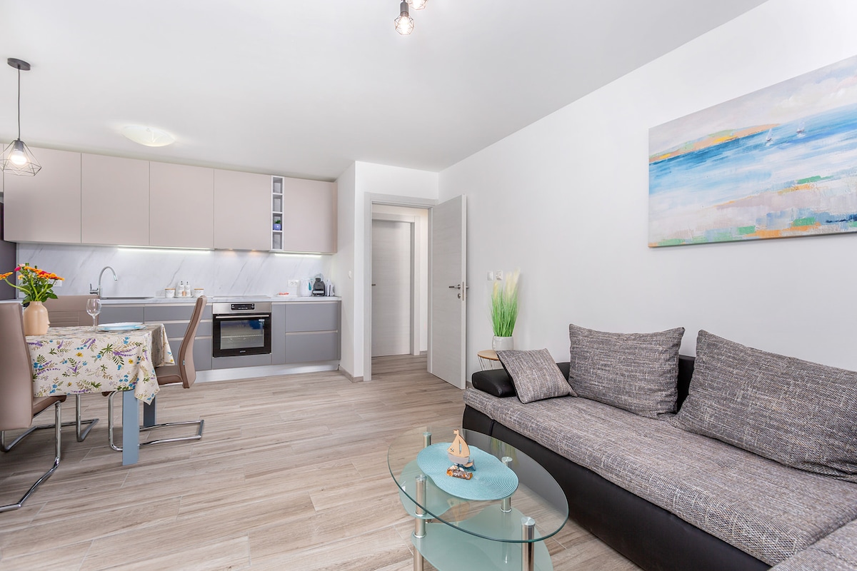 Bienvenue dans notre loft élégant sur le toit avec un grand balcon et un paysage panoramique incroyable. Réveillez-vous avec les 50 nuances de bleu de la mer Adriatique. Une image si parfaitement conçue qu'elle guérit votre âme. Regardez les véliplanchistes dans la baie tôt le matin, et profitez d'un brunch relaxant dans le calme et la tranquillité. Admirez la beauté des tempêtes de loin, découvrez des plages secrètes à proximité et admirez de superbes couchers de soleil depuis notre confortable salon sur le balcon. Respirez, ralentissez et créez des souvenirs inoubliables.