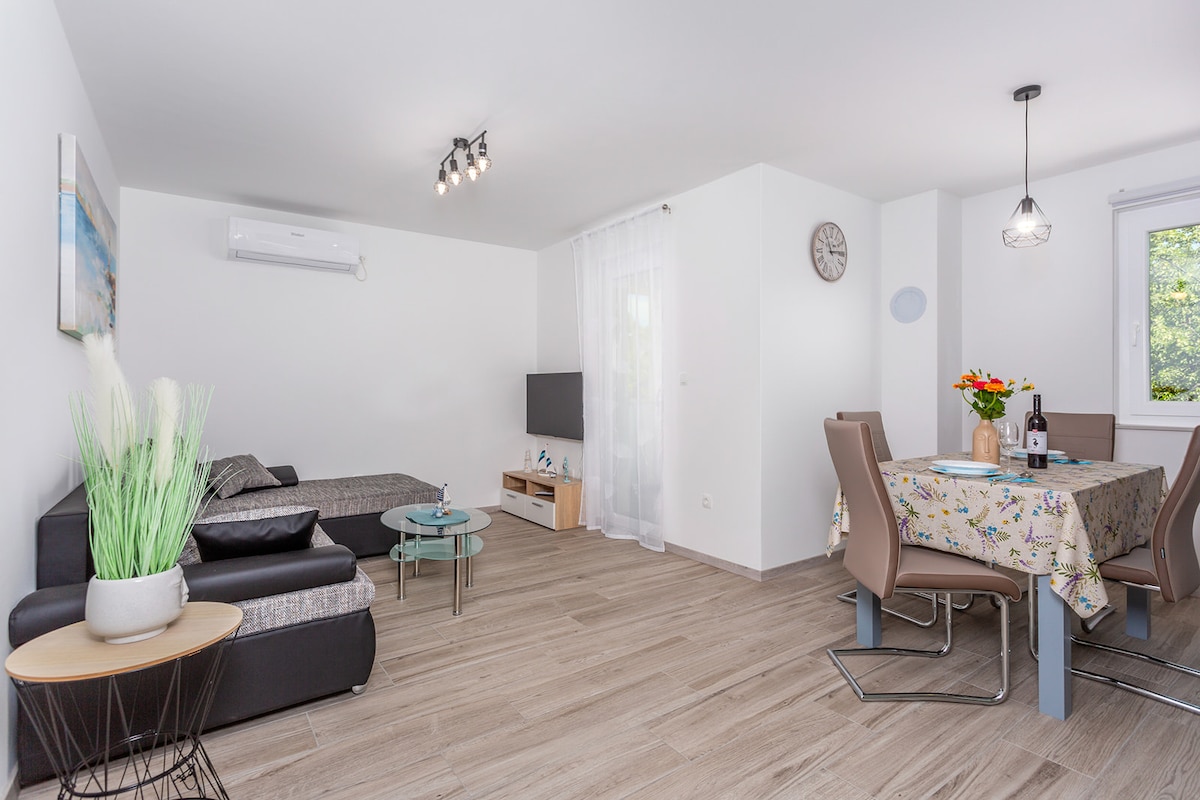 We are happy to welcome you to our newly renovated apartment in the suburbs of Rijeka, with a large private free parking, only 4 km from the city center and the coast. We are located near the exit from the highway so you will reach the beaches, Opatija or Krk very quickly. This comfortable and clean studio apartment is suitable for a couple with or without children or business travelers, we can also accommodate a third and fourth person on a sofa bed and a fifth on a extra bed in the apartment.