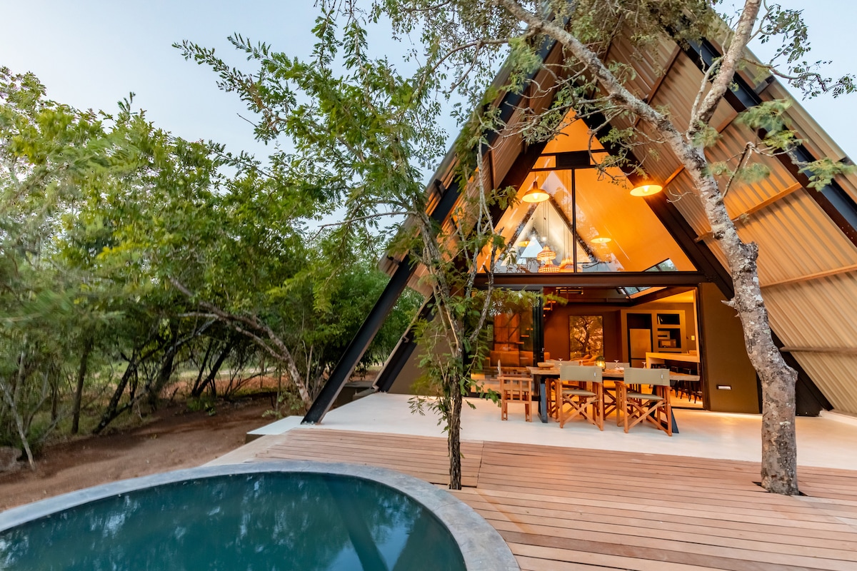 Ce logement unique a un style qui lui est propre. Une maison moderne en forme de A nichée au cœur de la brousse, en bordure du parc national Kruger à Marloth Park. Cette propriété unique promet une expérience unique alliant beauté moderne et naturelle. La maison est baignée de lumière naturelle, grâce à ses hauts plafonds et ses grandes fenêtres, créant une atmosphère aérée. Des lignes épurées et des intérieurs lumineux définissent le design contemporain, offrant une retraite confortable et élégante.