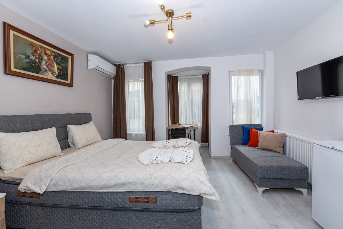 Cette suite dispose d'une kitchenette privée et d'une salle d'eau moderne avec jacuzzi, la suite dispose de fenêtres assez spacieuses, d'un aménagement spacieux et pratique, il y a un service de ménage tous les 3 jours, vous pouvez rejoindre les lieux historiques depuis notre bâtiment en 10 minutes à pied et vous pouvez visiter les lieux historiques de la vieille ville et faire du shopping. Grand Bazar,Sainte-Sophie. Mosquée Sultanahmet. Citerne basilique,le palais de Topkapi en font partie. L'arrêt du tramway est à environ 7-8 minutes à pied.