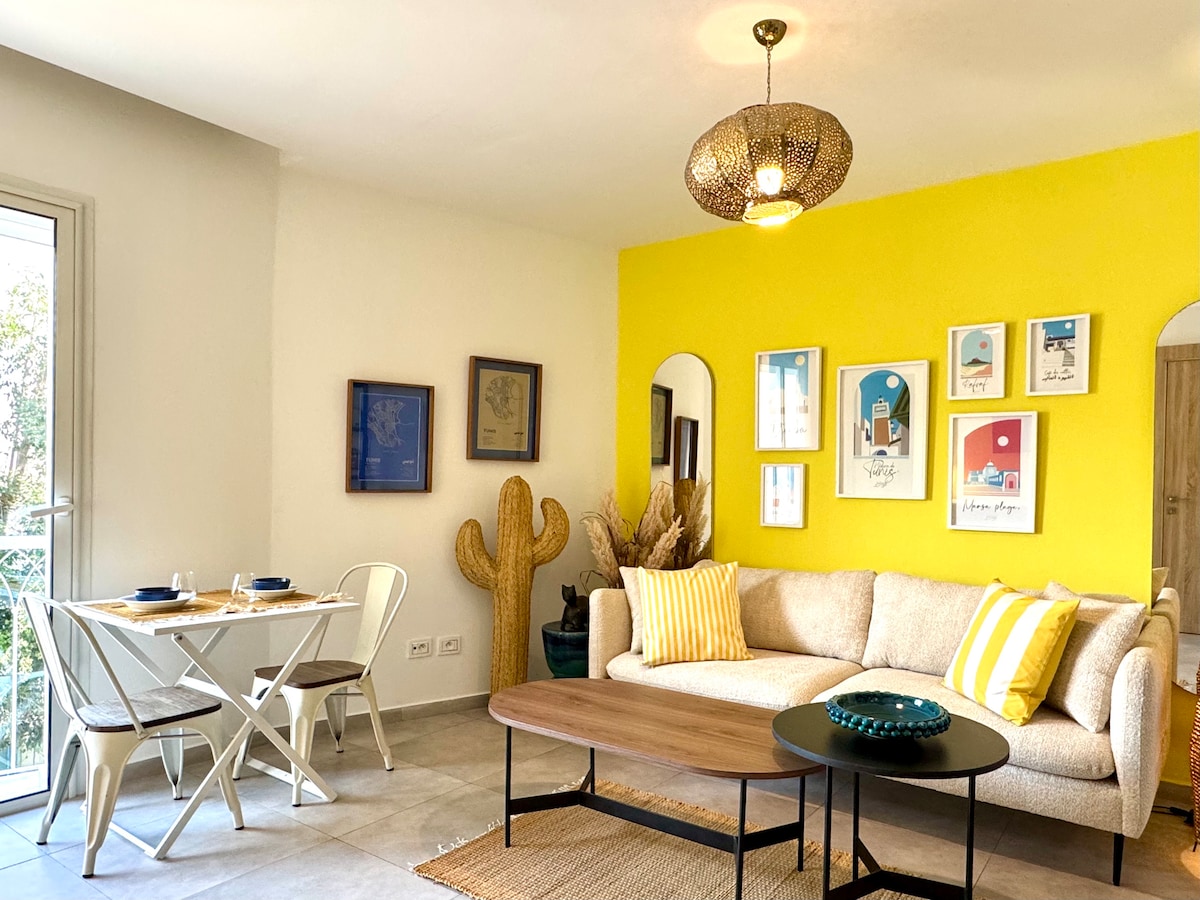 Ce superbe 2 pièces haut de gamme avec vue mer, spacieux et lumineux, à la décoration moderne et raffinée se situe au centre de la Marsa,à 100 m de la plage dans un immeuble neuf et sécurisé dans la chic banlieue Nord de Tunis. L’appartement est très confortable et pratique,se trouvant sur le boulevard principal(commerces, restaurants, cafés..)tout est accessible à pied. Entièrement équipé, il dispose de tout ce dont vous aurez besoin !Idéal pour vos séjours professionnels ou pour vos vacances.