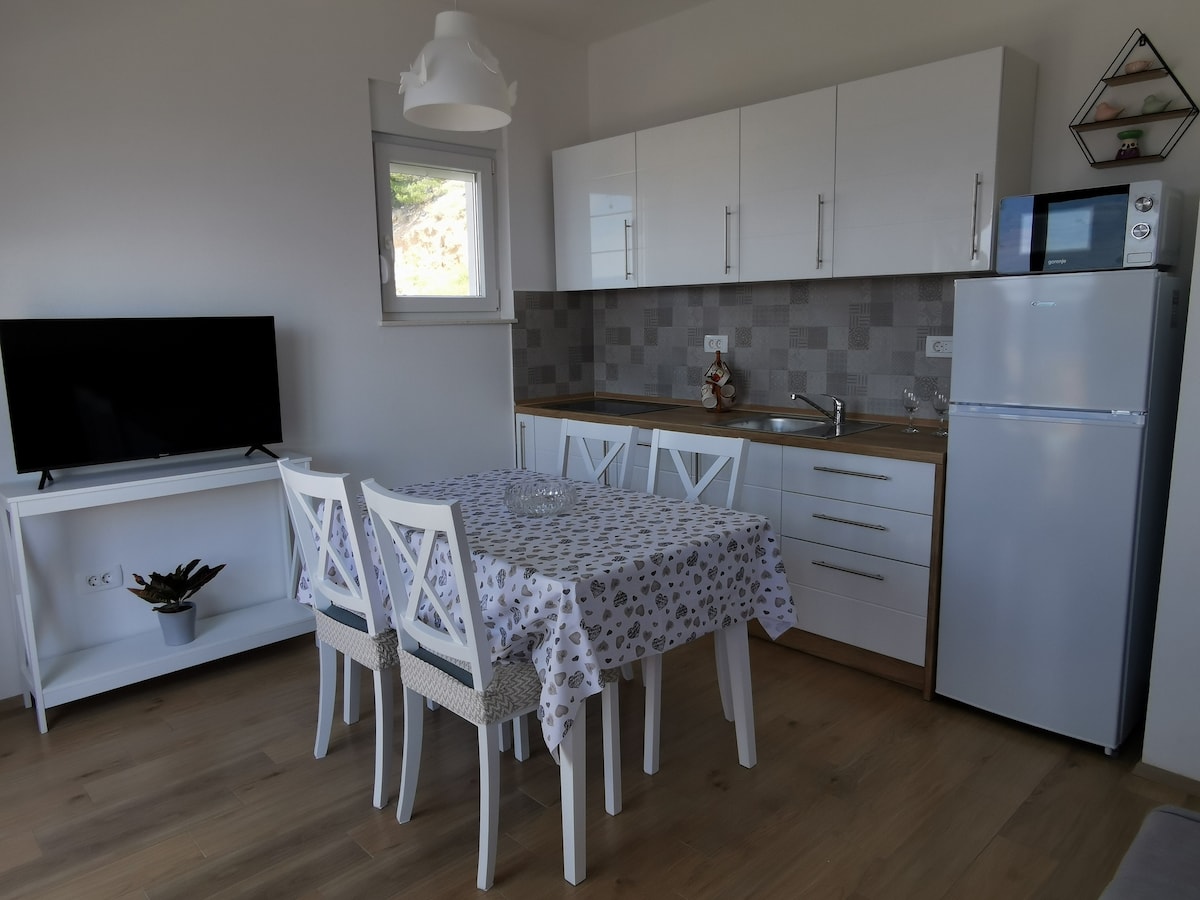 Bel appartement près de la plage. Convient pour des vacances tranquilles ou pour travailler à domicile en toutes saisons. Une nature merveilleuse où les montagnes touchent la mer. Vue magnifique sur la mer, les montagnes et les îles voisines. Idéal pour se promener, rester dans la nature et profiter de la mer. Dans les villes voisines d'Omiš et de Makarska, riches en histoire et en légendes de pirates, vous trouverez de riches marchés avec des aliments issus de l'agriculture biologique et des restaurants de cuisine fine et locale et de spécialités gastronomiques locales. Les environs offrent de nombreux terrains de camping.