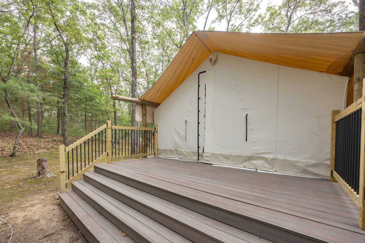 Escapade ✨ paisible en tente de glamping ✨ Évadez-vous dans notre confortable tente de glamping d'une chambre, nichée au milieu des arbres avec votre propre terrasse et foyer. À l'intérieur, détendez-vous sur un futon queen avec un petit chauffage électrique pour plus de confort. Les bains publics du camping se trouvent à quelques pas seulement. 🌲 Nature et confort Terrasse surélevée et foyer privés 🔥 Piscine de saison 🏊 Basketball 🏀 Fers à cheval 🎯 Minigolf ⛳ 📍 À seulement 25 km du Gillette Stadium ⚠️ Remarque : le linge de lit n'est pas fourni. Veuillez apporter le vôtre.