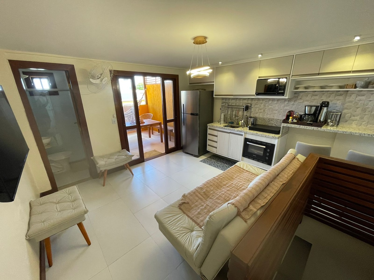 Refuge exclusif dans la réserve de Sapiranga ! Appartement avec jardin, piscine et espace barbecue privé, dans une copropriété neuve et exclusive de seulement 12 logements, à 9 km de la vie de Praia do Forte. Avec 1 chambre (lit Queen Size), il peut accueillir 2 personnes. Cuisine équipée avec cafetière, friteuse, machine à sandwich et ustensiles. À quelques pas de la Lagoa de Aruá, parfaite pour se détendre. Vivez des moments inoubliables dans un lieu plein de charme et de confort ! L'appartement dispose d'une piscine et d'un espace gastronomique avec machine à glaçons.