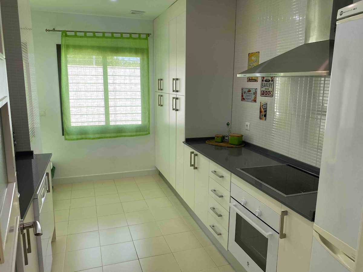 Apartamento en Chalet piscina y parking. Todo en exclusiva y completamente privado para los huéspedes. Dispone de wifi,aire acondicionado, lavavajillas,horno,microondas,cafetera, tostadora,secador del pelo,mesa de billar,smart tv,diana, juegos de mesa, juegos de playa… Supermercado y farmacia a 5 min andando. Playas a 10 min en coche. Parque acuático a 3 min. Máximo 4 personas. Cama de matrimonio y sofá cama. Posibilidad de cuna de viaje y trona de bebé. Se aceptan mascotas.