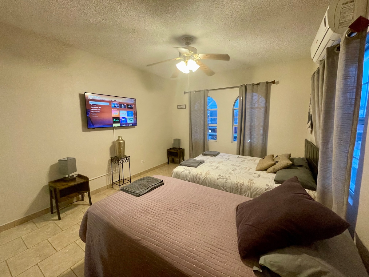 Situé dans un lieu calme et sûr, idéal pour les voyages en famille ou pour le travail. Proche des principaux points d'intérêt tels que : pont international pour traverser à Brownsville à seulement 10 min, consulat américain et CAS à 15 min environ, magasins de proximité ouverts 24 heures, différents restaurants de nourriture à proximité, dispose de 3 minisplit, wifi, 1 télévision par câble, 2 télévisions dans les chambres, notre priorité est que vous vous sentiez à la maison, c'est pourquoi nous prenons soin de chaque détail pour que votre séjour soit agréable.