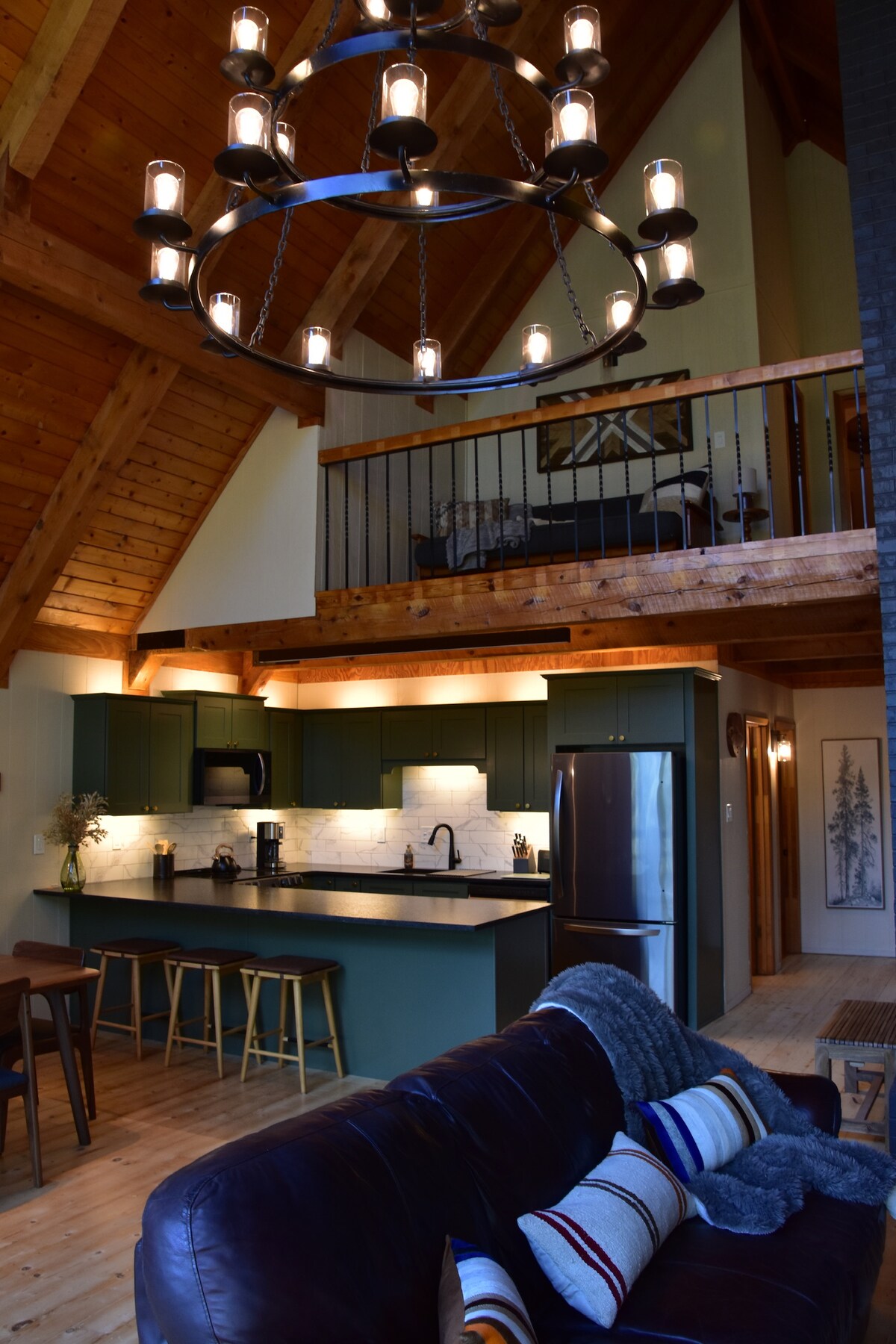 Chalet à concept ouvert entièrement rénové. Comprend 3 chambres privées, une grande chambre à coucher privée avec 3 lits superposés pleine grandeur, une cuisine ouverte, un coin salon et 3 salles de bain complètes. À l'extérieur, vous trouverez une belle terrasse couverte avec barbecue, jacuzzi et de nombreux sièges pour profiter d'une vue imprenable. Peut accueillir confortablement 8 à 12 personnes. La cour est zéro scape, y compris des zones gazonnées pour les jeux de pelouse et un foyer extérieur. Chalet NON-FUMEUR et aucun animal de compagnie.
