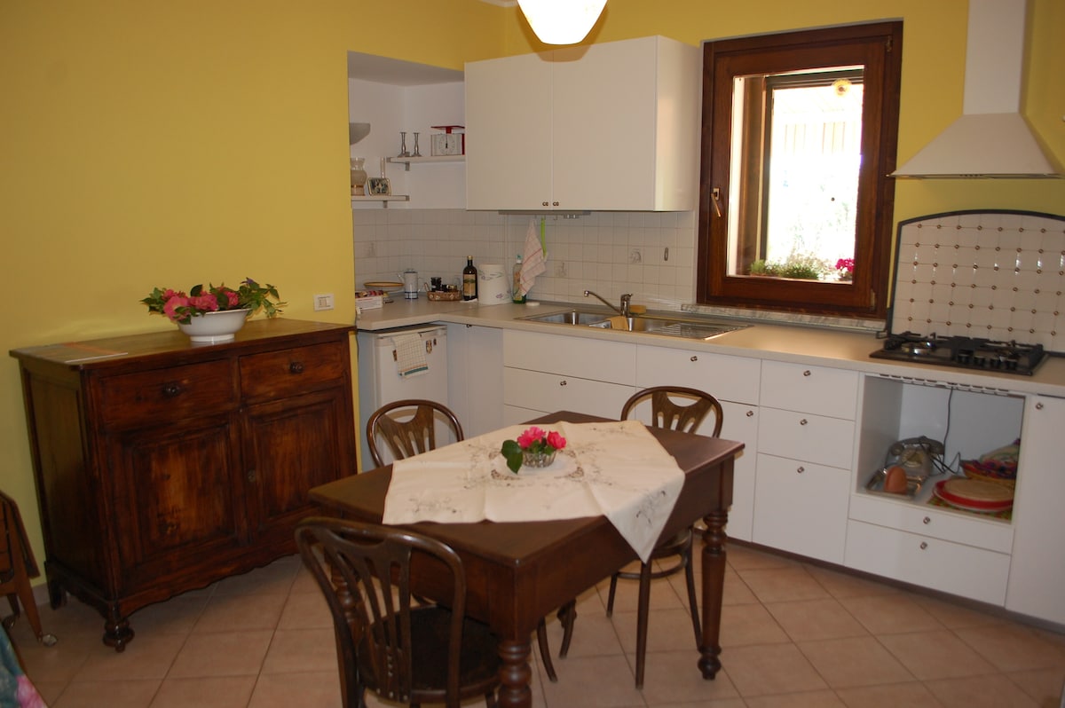 Notre appartement est situé dans un hameau du village voisin, à seulement 8 km de Biella. Il fait partie d'une ferme rénovée, en plein milieu des bois et des prairies. L'appartement est au rez-de-chaussée et a sa propre entrée (séparée du reste de la maison). En face de l'appartement, il y a une cour, avec un gazebo et un barbecue, où vit notre chien (elle est très sympathique). Le matin, vous pourriez être réveillé par le chant du coq et des poules.