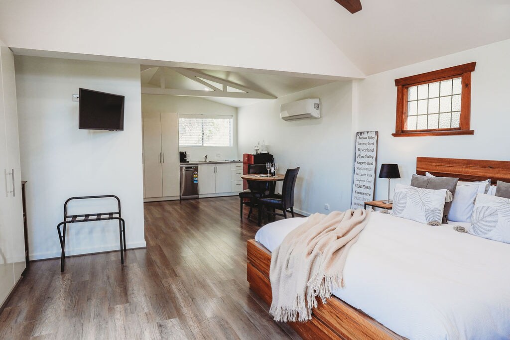 WayWood Wines & Accommodation est un vignoble et un service d'hébergement de vacances à Mclaren Flat. Grand studio récemment rénové, avec salle de bain attenante et buanderie. Parfait pour un couple. Situé sur une propriété de 10 acres, avec un vignoble en activité et une vue imprenable sur McLaren Vale. À seulement 35 minutes de l'aéroport d'Adélaïde ou du CBD, à 10 minutes de la plage et du canton de McLaren Vale. 10 vignobles accessibles à pied, plus de 70 autres à 10 minutes en voiture.