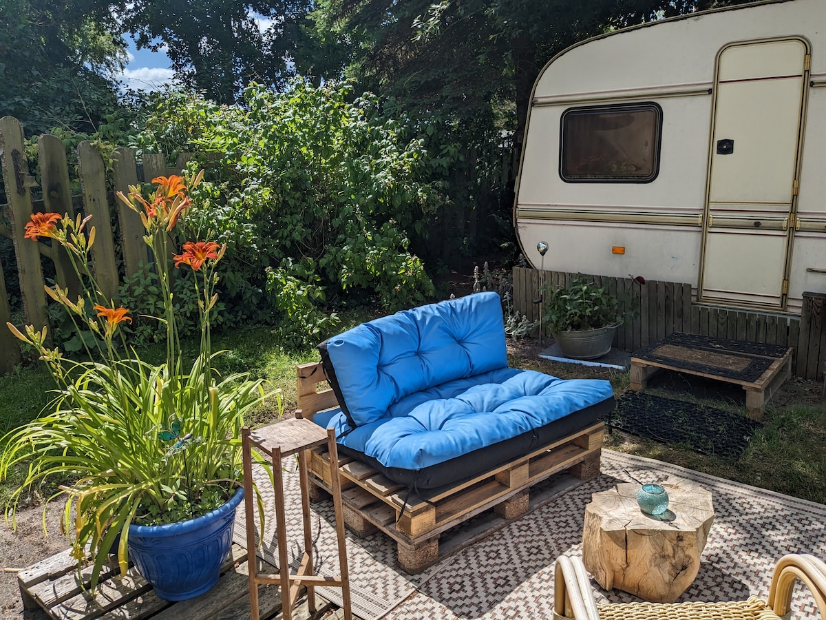 Une roulotte spacieuse et confortable entièrement équipée. Situé dans une rue de village très calme, entre la maison principale et le voisin dans un jardin naturel. Chambre à coucher donnant sur le jardin avant, coin salon donnant sur les framboises, petite cuisine, réfrigérateur/cuisinière à gaz, eau courante. Eau de système de pompe (froide). Petite salle de bain avec lavabo (froid). Jardin privé avec coin salon. Salle de bain privée dans la maison. 1 km de la zone de baignade ainsi que du sentier de randonnée de la mer Baltique. Le Darss et Zingst et Fischland sont facilement accessibles avec de bons vélos.
