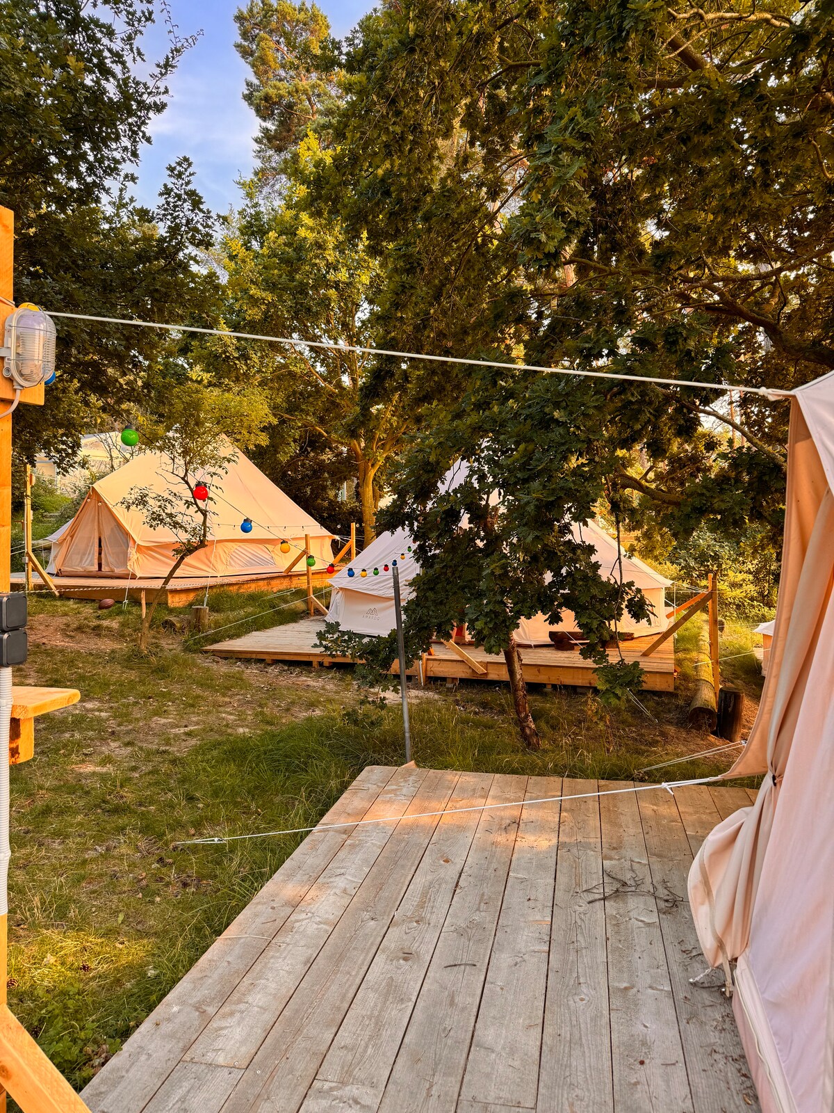 Louez l'une de nos deux grandes tentes familiales ! Chaque tente dispose de 2 cabines intérieures avec chacune un lit double et un matelas (190x160). Il y a aussi un petit vestibule dans la tente et une petite terrasse devant l'entrée, d'où vous pourrez profiter de la vue sur l'eau et les bateaux qui passent. Vous avez à votre disposition une petite cuisine extérieure avec cuisinière à gaz, casseroles et vaisselle - plus rien ne s'oppose donc à un dîner agréable au soleil couchant. Installations sanitaires à environ 50 m.