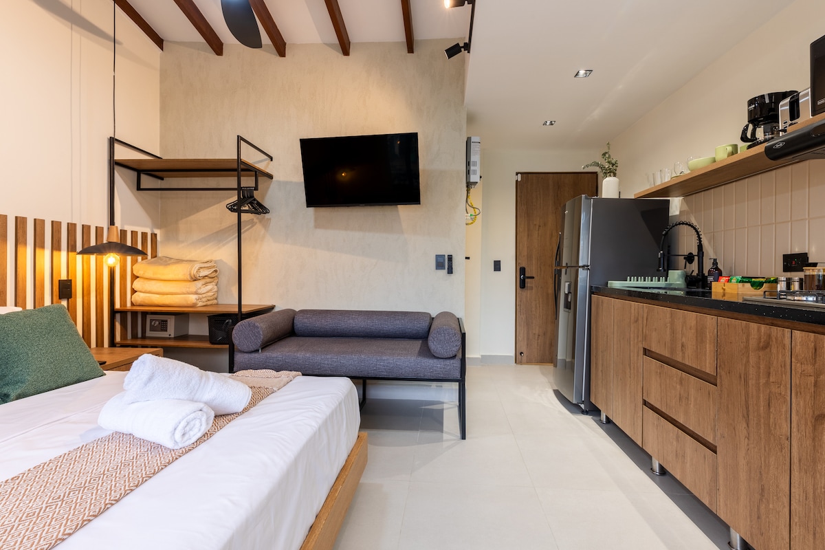 Cet endroit est à ne pas manquer. Nous avons 1 chambre 1 salle de bain avec jacuzzi. Un concept de cuisine ouvert entièrement équipé. Hauts plafonds. Décoration lumineuse moderne et télévision HD 55''. Cet hôtel est parfaitement situé à moins de 2 pâtés de maisons du Parque Lleras. À quelques minutes à pied des meilleurs restaurants de Medellín comme Carmen, El Cielo et Hanami. Si vous voulez être au cœur de l'action où les habitants traînent, c'est l'endroit où il faut être. Tout ce dont vous avez besoin est à quelques pas.