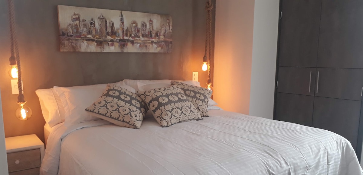 RÉNOVÉ RÉCEMMENT - Internet haut débit idéal pour le télétravail - Climatisation neuve - Appartement au design industriel rénové - Lit king size - Vue imprenable sur Medellín (croyez-moi, cela vaut la peine de séjourner ici) -19e étage - Emplacement imbattable à Poblado, près de Provenza et du parc Lleras - Accessoires modernes - Espace de vie spacieux - Télévision intelligente x 2 - Cuisine entièrement équipée - Tour de lave-linge et sèche-linge - Piscine - Salle de sport - Espace de travail - Restaurant à l'intérieur du bâtiment - Parking privé - Arrivée autonome. - Sécurité 24 h/24