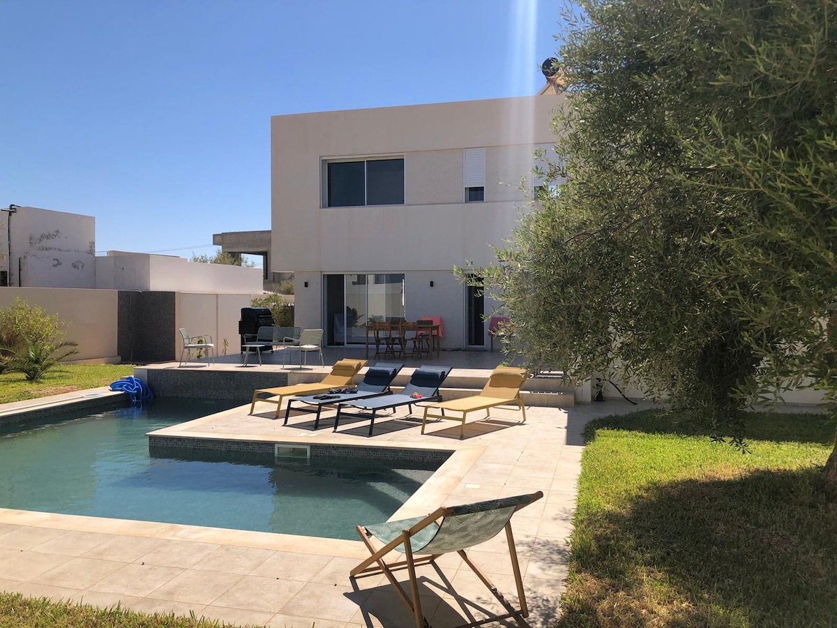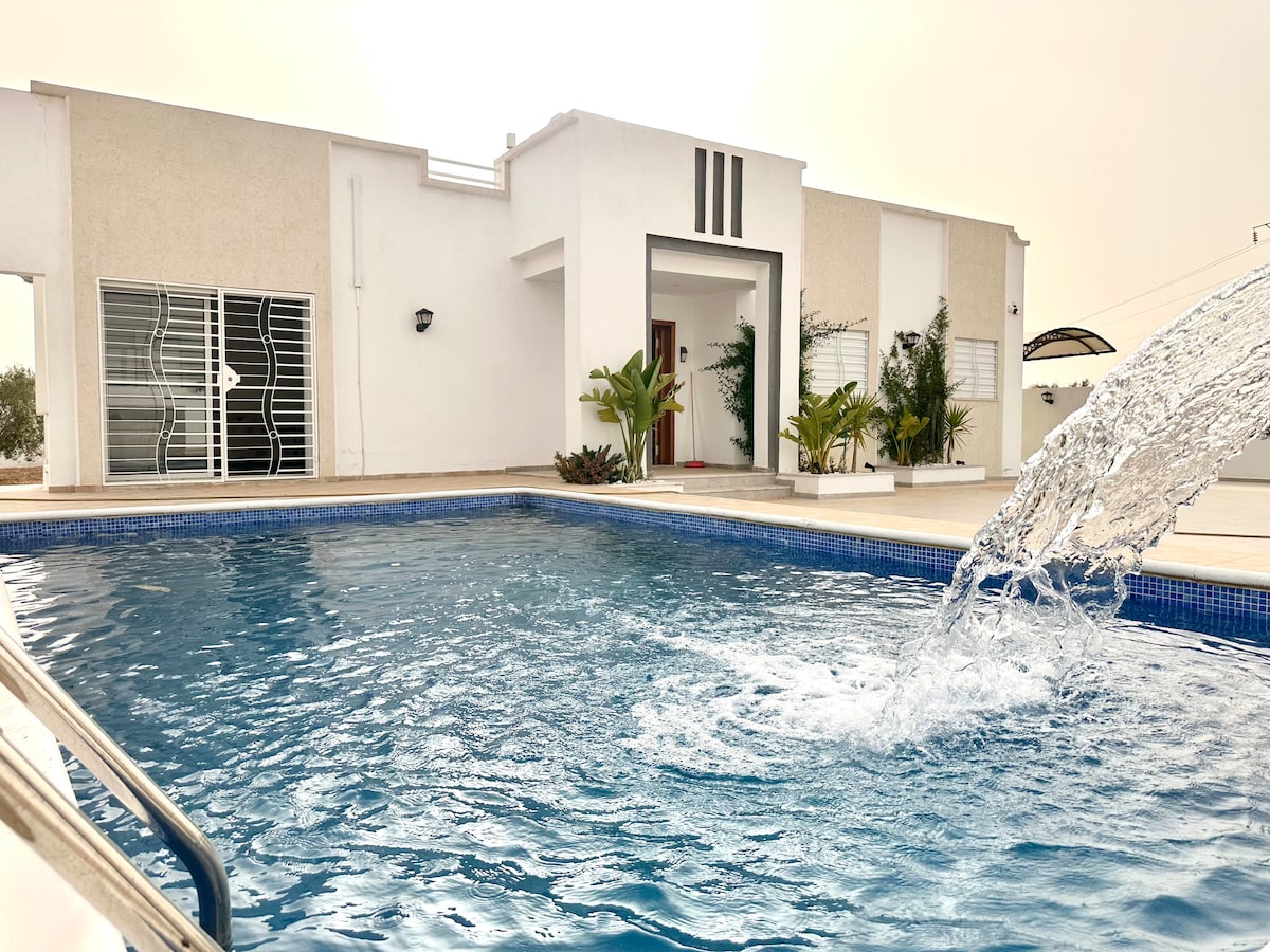 Profitez de cette belle villa entourée de palmiers avec un espace à couper le souffle,calme, paisible et sans vis à vis à vis à vis à vis à vis à vis à vis à vis à vis de Cette villa dispose de 3 chambres ( l'une est une suite avec vue sur la piscine), une cuisine entièrement équipée, une salle à manger et un salon, 2 salles de bains, une grande piscine (espace enfants aussi ) et un jardin spacieux avec barbecue. Ce logement est situé à Midoun, Chbabia, à 4 minutes du centre de Midoun et à 4 minutes en voiture de la plage d'Aghir. Nous aimons les animaux de compagnie, vos proches sont les bienvenus. 🫶