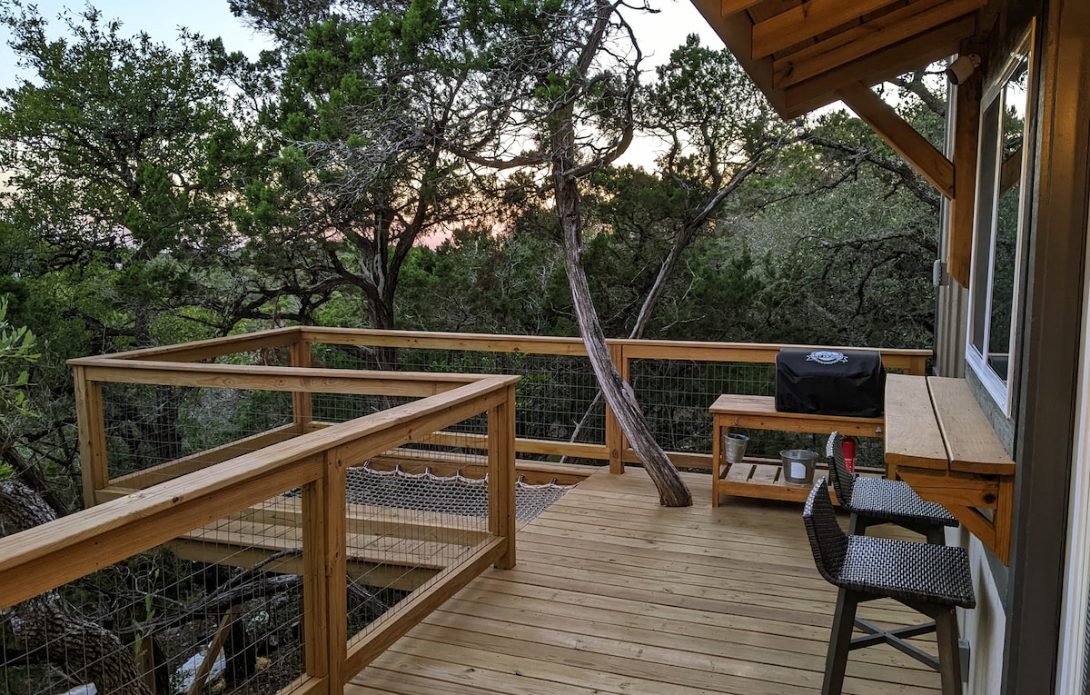 • Escapade en couple isolée dans le Texas Hill Country - Récompensée par le top 5% des logements d'Airbnb et « Coup de cœur voyageurs ». • Niché dans les arbres au sommet d'une colline (altitude 1800 pieds !) dans le magnifique Texas Hill Country. Conçu dans le seul but de créer un espace confortable pour les couples pour partager une occasion spéciale ou simplement pour échapper au stress et à l'agitation de la vie quotidienne. • Profitez des sentiers de randonnée ou détendez-vous simplement dans le hamac de la cabane dans les arbres surplombant la belle vallée. • Petit déjeuner inclus !