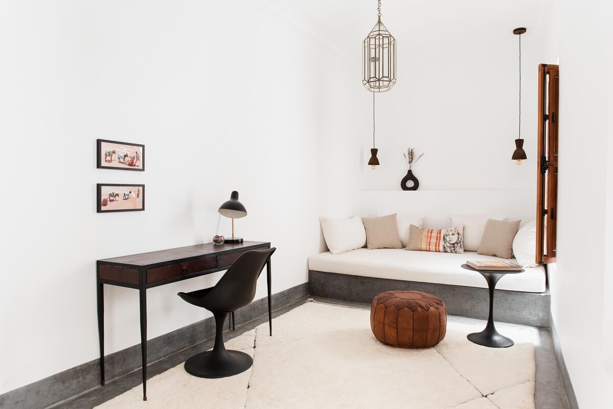 Bienvenue dans notre Riad récemment rénové au coeur de Marrakech : Dar Nurah Le Riad est à louer dans son intégralité, aucun autre invité ne partagera avec vous. Que vous soyez un couple, une famille ou un groupe d'amis, Dar Nurah sera le refuge parfait pour vos vacances à Marrakech. Un total d'environ 180m² à louer en exclusivité avec 2 chambres en suite joliment décorées, un salon avec un canapé convertible en lit supplémentaire et de nombreux espaces de vie ouverts.