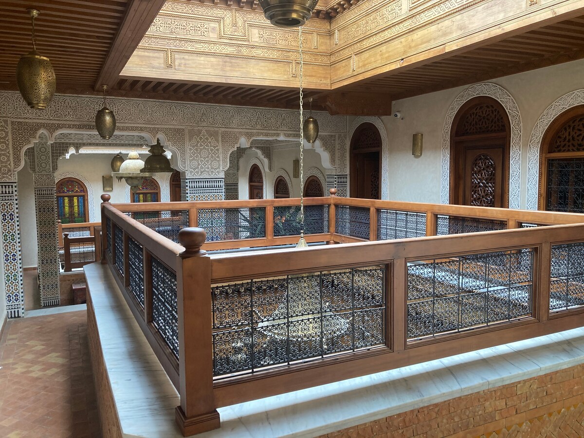 Riad Alkatib, maison de l’écrivain. C’est une des seules maison de la médina de Meknès qui a été rénovée sans subir aucune transformation la hauteur au plafond du Patio est de 18 m sur 3 niveaux, comporte 5 grandes ch ( surfaces de 20 à 30m2) avec sdb privative, cuisine équipée, Patio , réception:/salon Hammam et une terrasse vue sur la montagne Zerhoune et la ville. 10 ans de travaux pour préserver l’authenticité et l’âme de ce Riad, que je souhaite partager.