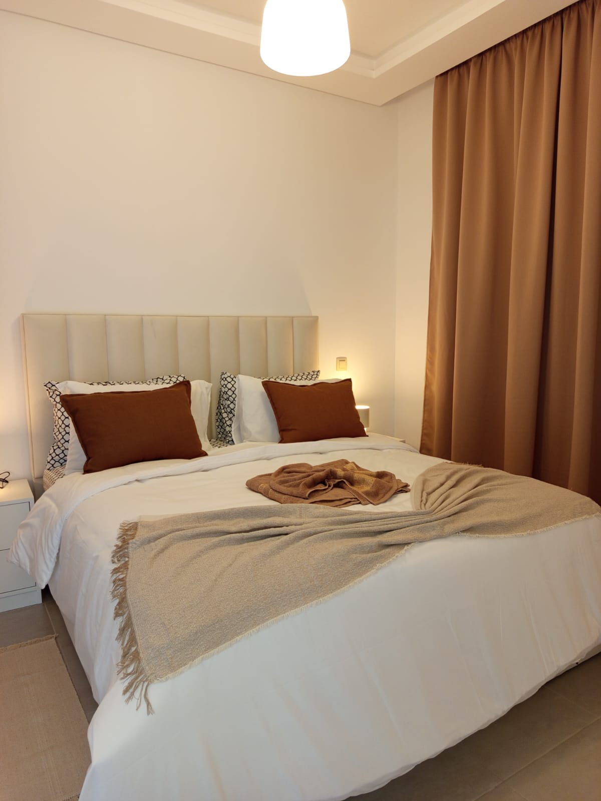 Bienvenue dans votre cocon de vacances proche de la mer ! Situé a 2 minutes a pieds de la plage de Martil, cet appartement neuf, lumineux et fraîchement meublé vous offrira un confort pour un séjour en famille. Niché dans une résidence sécurisée avec piscine, cette adresse est idéal pour se détendre au soleil et respirer l’air marin. L’appartement dispose d’une chambre avec un lit bébé parapluie. Puis un second espace nuit (dans le salon) avec un canapé qui se transforme en lit confortable.