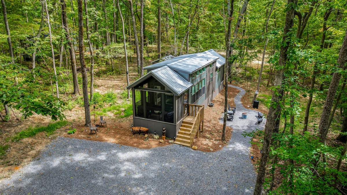 Nouvelle cabane construite directement sur la fourche ouest de la Little River à Mentone en Alabama. Le premier étage de Roux's Bends est un plan d'étage ouvert avec des fenêtres de 10 pieds s'étendant sur tout le devant de la maison, ce qui donne l'impression d'être dans une cabane moderne dans les arbres. Avec des matériaux de qualité supérieure, un design épuré et des détails bien pensés, Roux's Bend est l'endroit idéal pour se détendre, s'aventurer et découvrir la belle flore et la faune de la région.