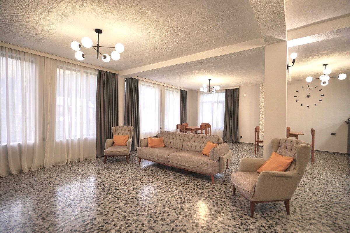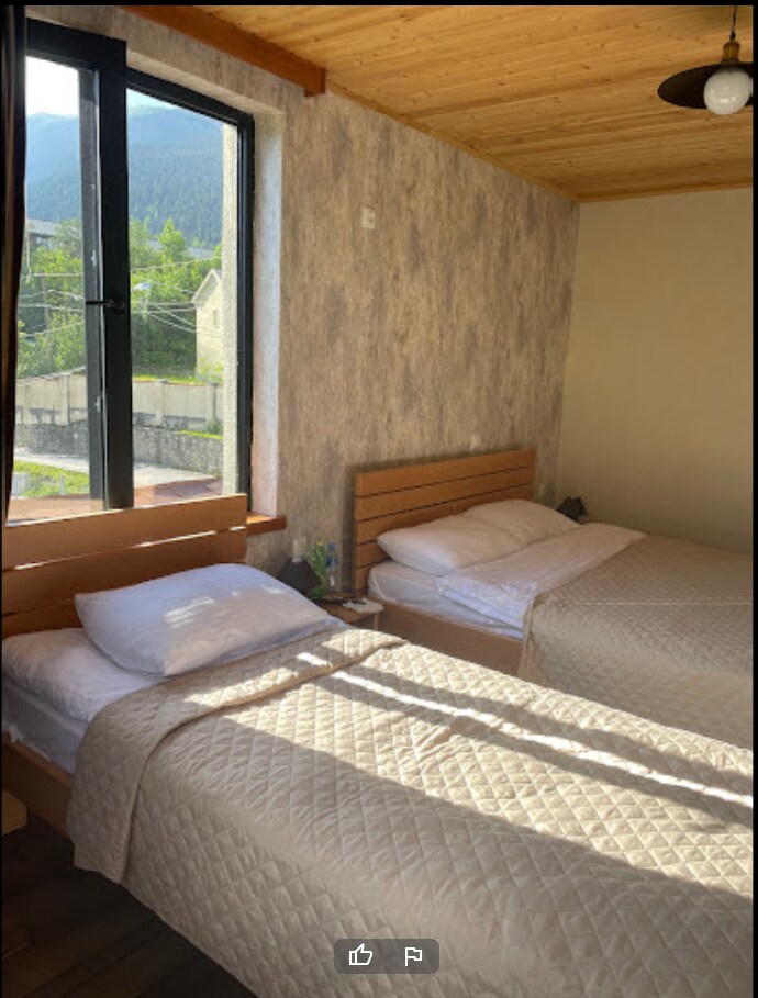 L'hôtel est situé sur le bord de la rivière. Les chambres offrent de beaux paysages aux montagnes et aux tours de Svaneti. Au rez-de-chaussée, il y a un café-bar et une cuisine, et dans les deuxième et troisième chambres, il y a dix, 5 doubles et 5 triples. L'hôtel est équipé d'un système de chauffage central, d'un circuit d'eau. Vous pouvez facilement rejoindre tous les sites touristiques à pied, ils sont à un kilomètre.