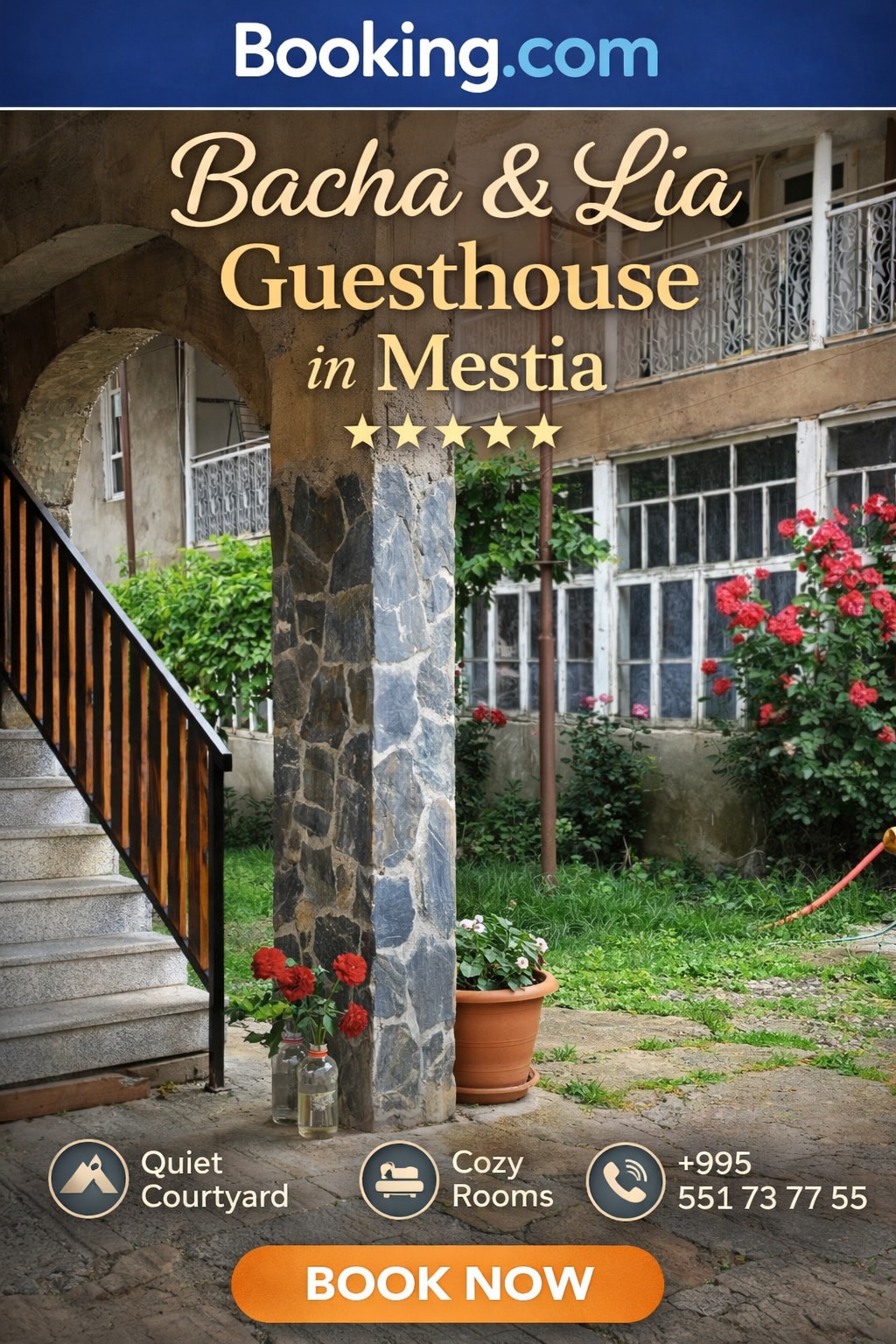 C'est une cour large et fleurie (également pour le camping ou le stationnement) que vous traverserez jusqu'à ce que vous entriez dans notre confortable chalet. Il est au milieu de Mestia, entouré de montagnes gigantesques et une rivière « Enguri » est à seulement 2 minutes à pied. Il y a 3 magasins à proximité et le centre de Mestia est à environ 15 minutes à pied (3 min en voiture). Le chalet est isolé et calme et il a tout pour vivre également pour les séjours de longue durée. (Nous avons des offres spéciales pour les travailleurs à distance/tous ceux qui sont intéressés à rester à long terme).