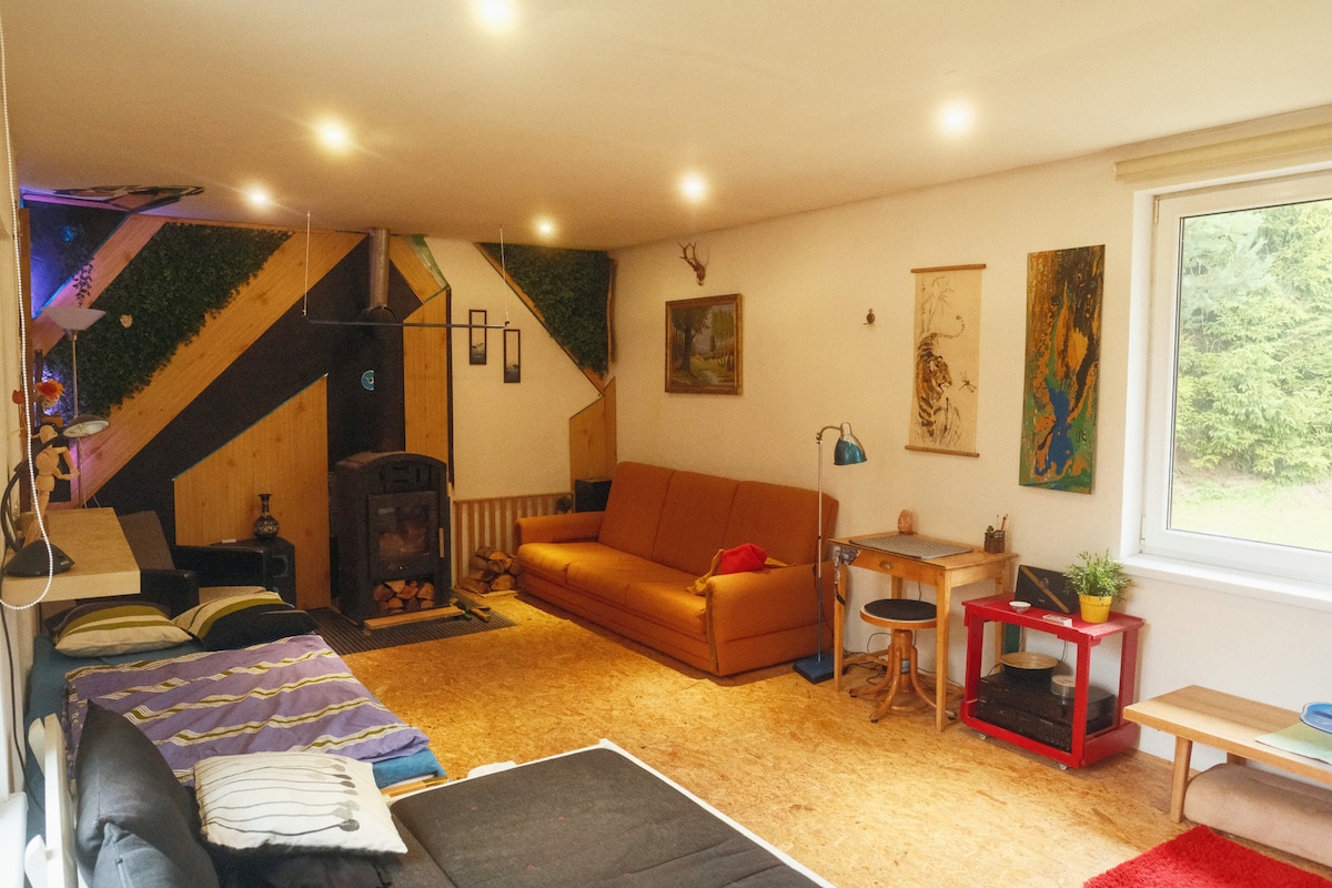 V momentě, kdy vstoupíte branou do zahrady vstoupíte do světa, který žije sám pro sebe. Nyní do vašeho světa. Chata je u cesty a moznosti zaparkovat. Ale tím jak je obroztlá stromy (živým plotem) máte absolutní soukromí. Co se týče výbavy. Kuchyň je vybavena absolutně. Od kávovaru, mlýnku na kafe, mysek až po útěrky a prostě snad vše. Mixéru... Dále venku na vás čeká zahrada s rovnou plochou pro aktivity a vzadu ohniště s posezením. Spí se na posteli, rozkládacím gauči či půdě kde jsou matrace.