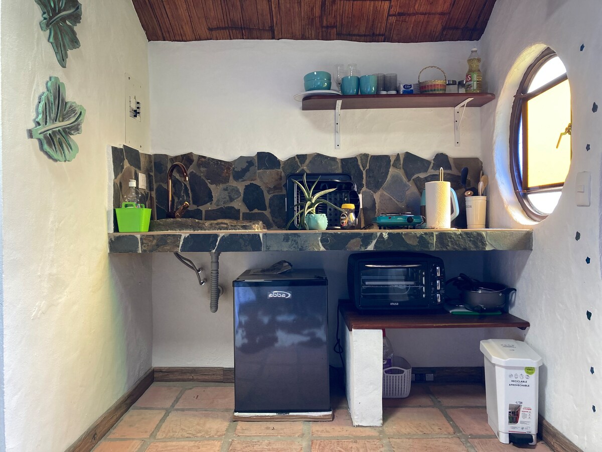 Casita Farolito est un espace charmant en plein cœur de la nature avec salle de bain privée, eau chaude, chambre avec cheminée, salon et beau jardin avec des plantes aromatiques et futales. Il dispose d'un plafond habitable sur lequel vous pourrez profiter du paysage. Il dispose d'une petite cuisine et des ustensiles de cuisine nécessaires pour cuisiner.