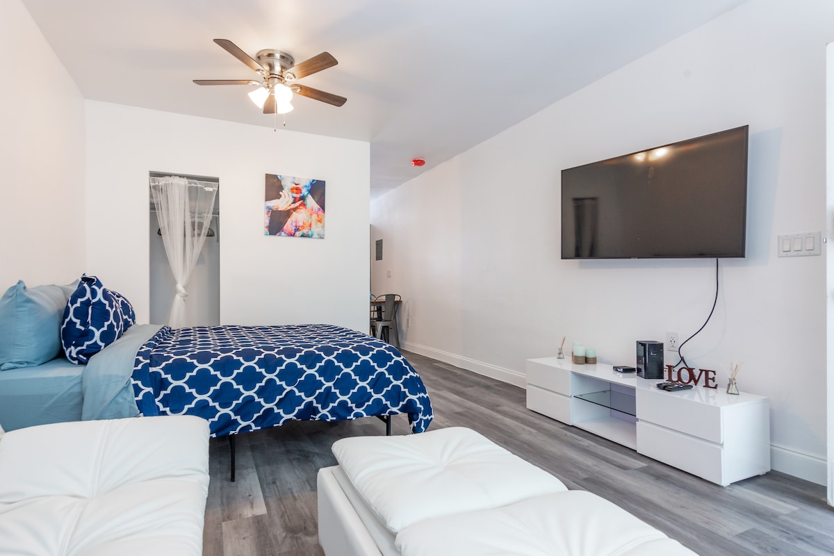 Magnifique appartement d'une chambre rénové à Miami Beach, dans un quartier calme et sûr à quelques pas de l'océan. Cet appartement offre un hébergement privé et calme pour les vacanciers et les voyageurs d'affaires. Le logement dispose d'un lit Queen Size confortable, d'un canapé-lit pour 1 personne, de cintres, d'un four à micro-ondes, d'un réfrigérateur de grande taille, d'une petite kitchenette, d'une télévision connectée, d'une connexion Wi-Fi gratuite et d'un nouveau climatiseur. Un stationnement public payant dans la rue est disponible selon le principe du « premier arrivé, premier servi ».