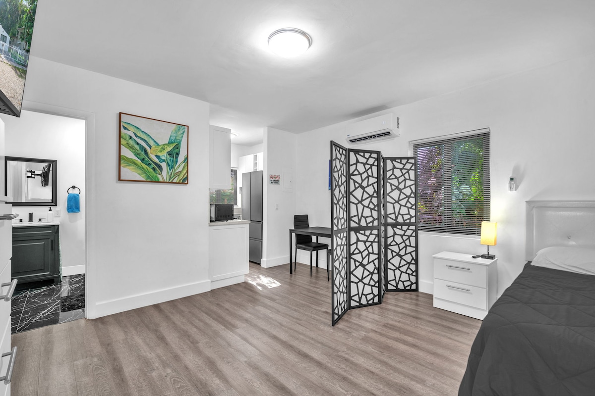 Studio privé et paisible avec sa propre entrée et vue sur le jardin. Détaché de la maison principale, il offre confort, calme et toutes les commodités essentielles. Base idéale pour explorer Miami, à seulement 15 minutes de South Beach, Wynwood et du centre-ville. Situé dans un quartier sûr et convivial avec d'excellents restaurants locaux à proximité. Une retraite confortable et pratique pour se détendre et se ressourcer.