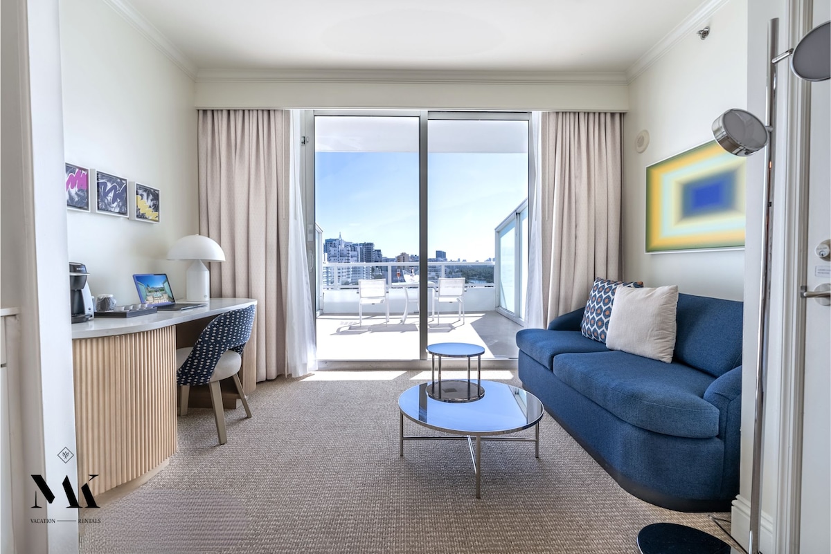 This ocean view junior suite is located in the luxurious Sorrento tower in the Fontainebleau Hotel in Miami Beach. The studio unit offers over 540 SF of interior space and an outdoor balcony. The condo sleeps up to 4 people between the king size bed and pull out sofa bed.