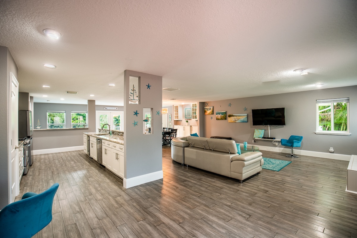 Profitez de la toute nouvelle grande piscine chauffée ! Cette maison offre 3 grandes chambres, chacune avec sa propre télévision en continu. Trois grandes salles de bains bien approvisionnées, prêtes pour votre plaisir. Espace de vie ouvert reliant la cuisine et le coin repas. Parfait pour votre retraite en famille. Stationnement pour bateau et VR disponible du côté ouest de la maison. Grande terrasse arrière avec gril à gaz. 2 lumières de sécurité dans la cour arrière. La natation est à vos propres risques. Nous avons hâte de vous retrouver, Votre équipe Getaways de la côte est de la Floride.