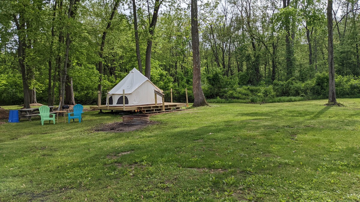 Notre tente Cabana Bell de 13' de diamètre sur notre rive privée est confortablement meublée avec 3 matelas pneumatiques, linge de maison, tapis. À l'extérieur, vous avez une table de pique-nique, un anneau de feu approvisionné en bois et un petit gril, du charbon de bois fourni pour le premier repas. (apportez du charbon de bois supplémentaire). Cruche d'eau de 5 gallons avec pompe à main. C'est un endroit idéal pour se reposer après une journée de plaisir et d'excitation à visiter notre rivière naturelle ou les vignobles et attractions locales.