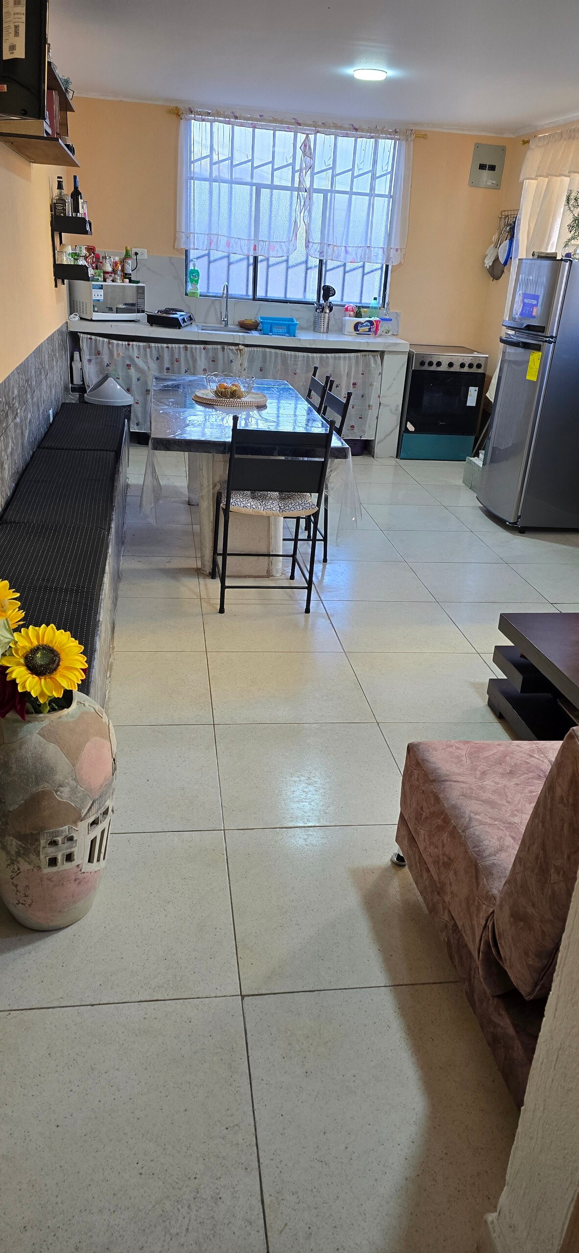 Appartement confortable rénové dans le quartier colonial de Quito, situé au troisième étage, un loft avec une vue panoramique spectaculaire sur le centre historique. Il dispose de deux chambres, de deux salles de bains, d'un salon, d'une salle à manger et d'une cuisine équipée d'eau filtrée et d'ustensiles essentiels pour répondre aux besoins de nos clients. Les installations confortables offrent une bonne détente. Nous avons le Wifi 620Mbps une 1.05Gbps, une ligne téléphonique, une télévision avec Netflix et des radiateurs pour la douche et les éviers de cuisine.