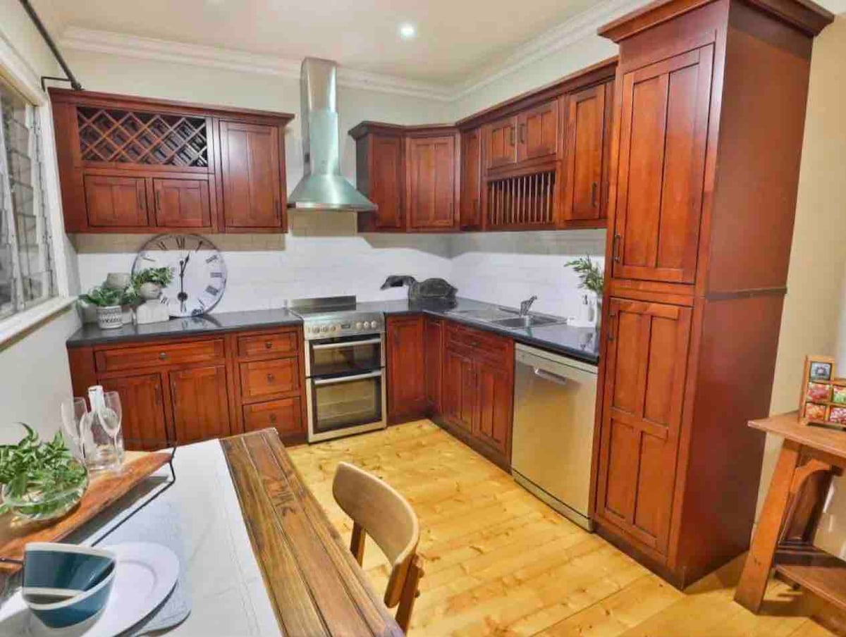 PISCINE CHAUFFÉE - Profitez d'une expérience élégante. Retraite familiale avec une piscine chauffée immaculée et un vaste espace de divertissement extérieur. À quelques minutes d'un magnifique terrain de jeu clôturé pour les enfants (Park for Play), et à quelques minutes en voiture de la rivière, des cafés, du parcours de golf et des supermarchés. Parfait pour les escapades relaxantes, les rassemblements et la commodité quotidienne facile dans ce logement central. Nous avons également deux lits pliants si vous avez des invités supplémentaires. Animaux acceptés, logement entièrement clôturé