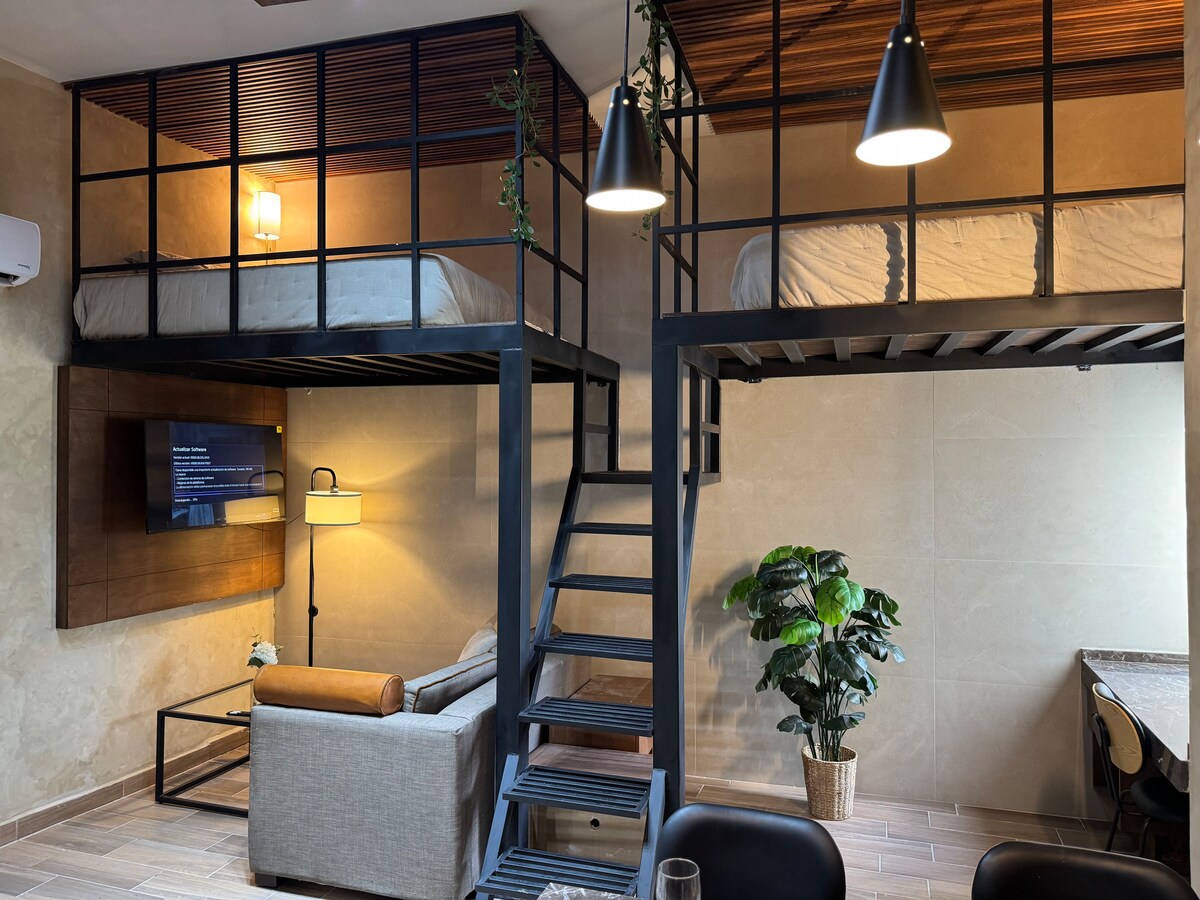 « Bienvenue au meilleur endroit de Monterrey » Parfait pour les cadres, les couples amis ou les touristes à la recherche d'un espace fonctionnel avec une touche élégante. ✨ Ce que vous trouverez : • 🛏️ Deux lits doubles en mezzanine + canapé-lit pour se reposer confortablement. • 📺 Netflix inclus, Wi-Fi, Smart TV. • ❄️ Climatisation pour votre confort. • 🏊♂️ Une grande piscine au design élégant, parfaite pour se rafraîchir et se détendre.