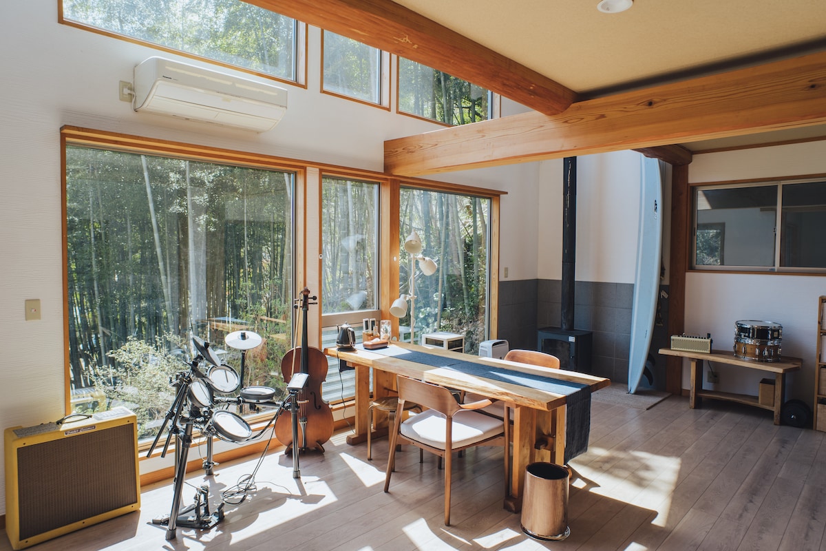 Maison scandinave spacieuse entourée de verdure. Le jardin et la terrasse sont en annexe. Une promenade de 5 minutes jusqu'à la plage d'Ohama. Vous pourrez profiter d'un barbecue dans le jardin. Il y a une serviette de visage, une serviette de bain, une brosse à dents, du toner, etc. Nous vous fournissons un parasol, une body board, une luge pour le ski de sable, des chaises extérieures, une glacière, un lit pour bébé. À 5 minutes en voiture de la maison à la grotte de Ryugu et au spot de ski de Geo !