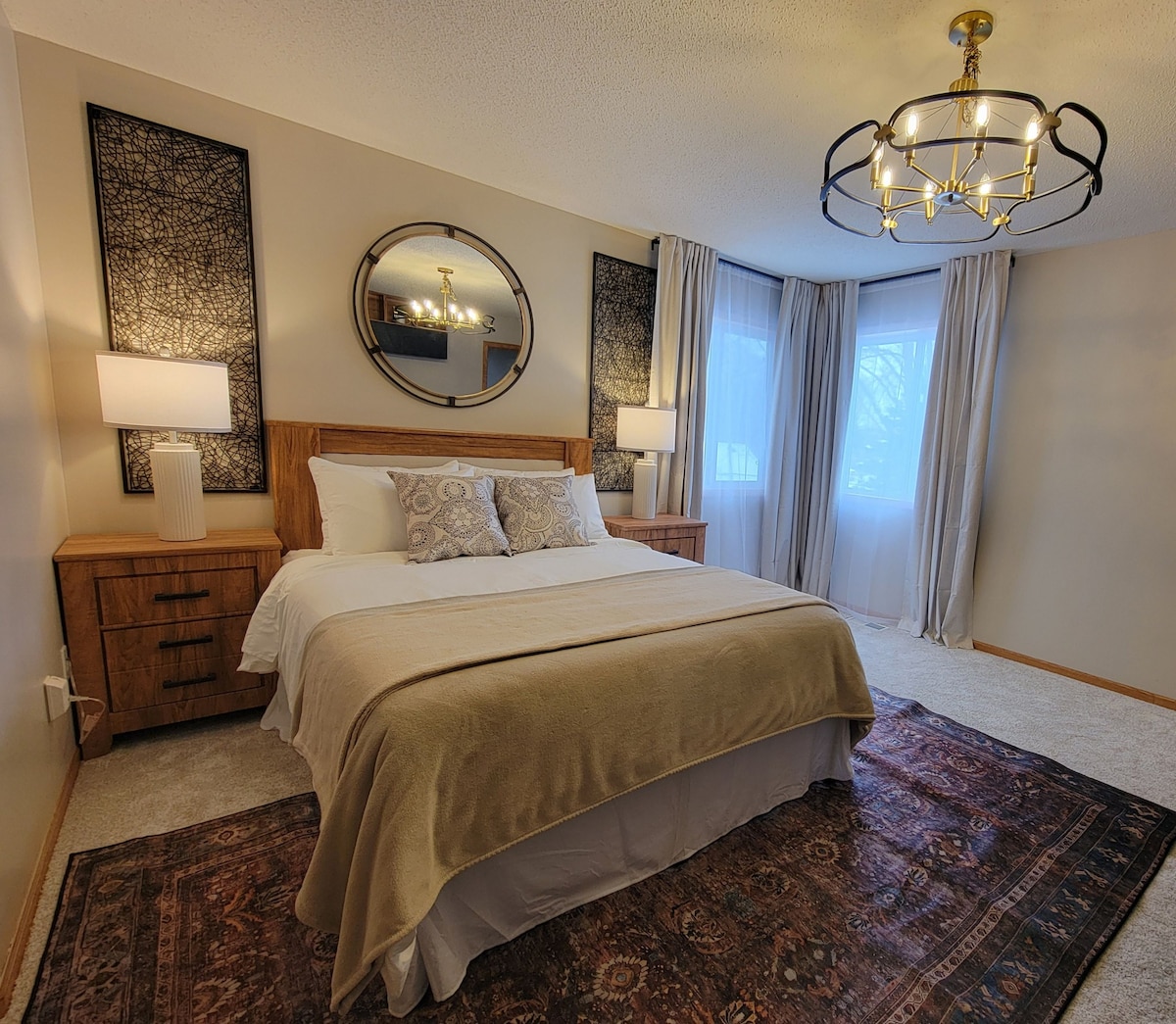Entrez dans Minne-GetAway: Modern Cottage et détendez-vous dans ce logement calme et élégant. Nous avons soigné le design distinctif de cette maison jumelée pour le voyageur de bon goût qui recherche un répit d'un style de vie actif. Du canapé en cuir rouge cerise, des fauteuils design, de la table basse en béton à la chambre Peacock ou à la suite parentale avec une peinture de renommée mondiale, « Le Baiser », vos sens seront ravis par la sensation aérée du chalet moderne avec ses hauts plafonds.